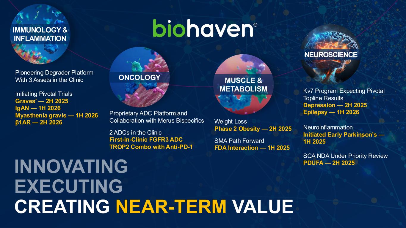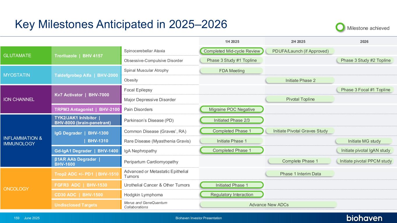 1H 2025 2H 2025 2026 GLUTAMATE Troriluzole  |  BHV 4157 Spinocerebellar Ataxia Obsessive-Compulsive Disorder MYOSTATIN Taldefgrobep Alfa  |  BHV-2000 Spinal Muscular Atrophy Obesity ION CHANNEL Kv7 Activator  |  BHV-7000 Focal Epilepsy Major Depressive Disorder  TRPM3 Antagonist  |  BHV-2100 Pain Disorders INFLAMMATION &   IMMUNOLOGY TYK2/JAK1 Inhibitor  | BHV-8000 (brain-penetrant) Parkinson’s Disease (PD)  IgG Degrader |  BHV-1300  |  BHV-1310 Common Disease (Graves’, RA) Rare Disease (Myasthenia Gravis) Gd-IgA1 Degrader  |  BHV-1400 IgA Nephropathy β1AR AAb Degrader  | BHV-1600 Peripartum Cardiomyopathy ONCOLOGY Trop2 ADC +/- PD1  | BHV-1510 Advanced or Metastatic Epithelial  Tumors FGFR3  ADC  |  BHV-1530 Urothelial Cancer & Other Tumors CD30 ADC  |  BHV-1500 Hodgkin Lymphoma Undisclosed Targets Merus and GeneQuantum Collaborations Phase 3 Study #1 Topline FDA Meeting Pivotal Topline Completed Phase 1  Complete Phase 1 Initiate Phase 1 Completed Phase 1  Phase 1 Interim Data Regulatory Interaction Key Milestones Anticipated in 2025–2026 PDUFA/Launch (if Approved)Completed Mid-cycle Review Initiated Phase 2/3 Initiate Phase 2 Phase 3 Study #2 Topline Initiate Pivotal Graves Study Initiate pivotal IgAN study Initiated Phase 1 Phase 3 Focal #1 Topline Initiate pivotal PPCM study Initiate MG study Advance New ADCs June 2025 Migraine POC Negative Biohaven Investor Presentation159 Milestone achieved