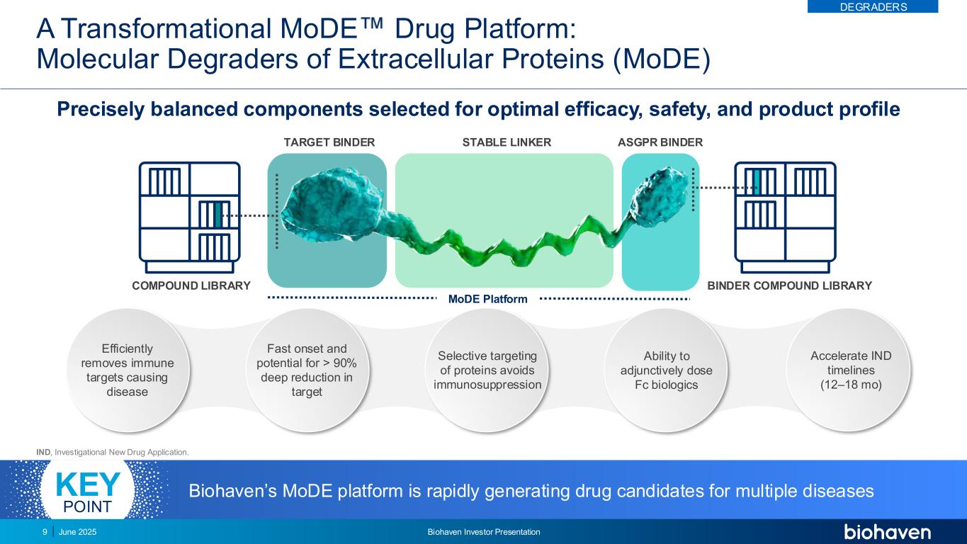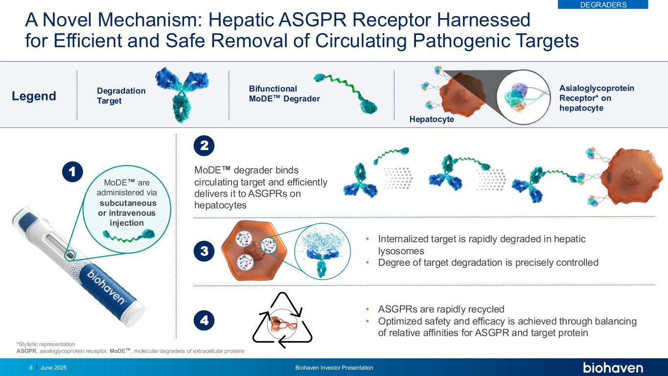 A Novel Mechanism: Hepatic ASGPR Receptor Harnessed  for Efficient and Safe Removal of Circulating Pathogenic Targets  subcutaneous or intravenous  injection MoDE  are administered via *Stylistic representation ASGPR, asialoglycoprotein receptor; MoDE , molecular degraders of extracellular proteins • Internalized target is rapidly degraded in hepatic  lysosomes • Degree of target degradation is precisely controlled 3 1 Legend Degradation  Target Bifunctional  MoDE  Degrader Asialoglycoprotein  Receptor* on  hepatocyte • ASGPRs are rapidly recycled • Optimized safety and efficacy is achieved through balancing  of relative affinities for ASGPR and target protein 4 MoDE  degrader binds  circulating target and efficiently  delivers it to ASGPRs on  hepatocytes 2 DEGRADERS Hepatocyte June 2025 Biohaven Investor Presentation8