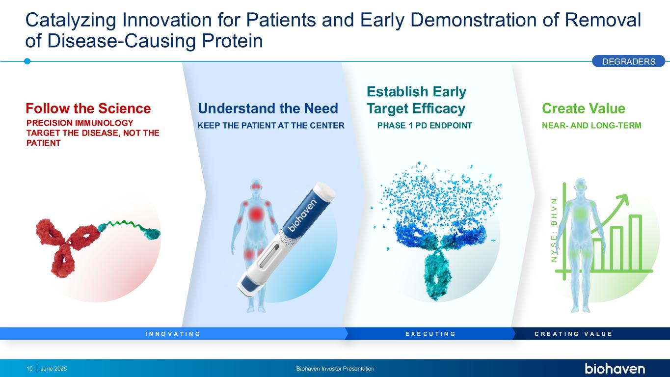 Catalyzing Innovation for Patients and Early Demonstration of Removal  of Disease-Causing Protein June 2025 Biohaven Investor Presentation10 C R E A T I N G  V A L U EE X E C U T I N GI N N O V A T I N G Follow the Science Understand the Need PRECISION IMMUNOLOGY  TARGET THE DISEASE, NOT THE  PATIENT KEEP THE PATIENT AT THE CENTER Establish Early  Target Efficacy Create Value NEAR- AND LONG-TERM DEGRADERS PHASE 1 PD ENDPOINT N Y S E :   B H V N