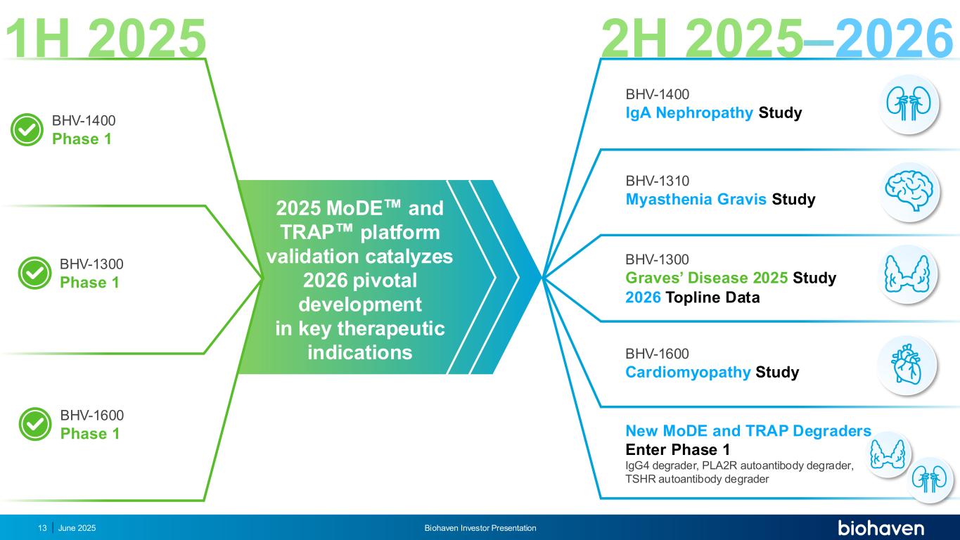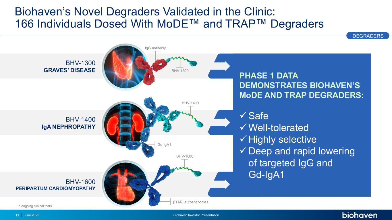 BHV-1600 PERIPARTUM CARDIOMYOPATHY Biohaven’s Novel Degraders Validated in the Clinic: 166 Individuals Dosed With MoDE  and TRAP  Degraders BHV-1400 IgA NEPHROPATHY BHV-1300 GRAVES’ DISEASE PHASE 1 DATA   DEMONSTRATES BIOHAVEN’S  MoDE AND TRAP DEGRADERS: ✓Safe  ✓Well-tolerated  ✓Highly selective ✓Deep and rapid lowering  of targeted IgG and  Gd-IgA1 Gd-IgA1 BHV-1400 IgG antibody BHV-1300 β1AR  autoantibodies  BHV-1600 In ongoing clinical trials  DEGRADERS 11 June 2025 Biohaven Investor Presentation
