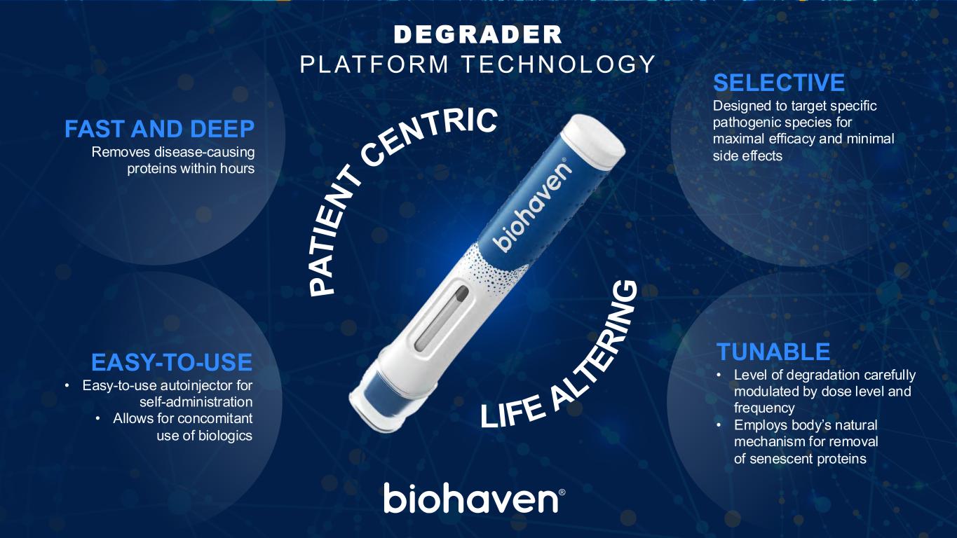 Gd-IgA1 IgG antibody BHV-1300 TRAPMoDE OUR NOVEL  DEGRADER  PLATFORM Revolutionary Yale-licensed technology to remove disease-causing proteins from the bodyKEY  POINT Target a class of proteins  implicated in pathogenesis  of disease Remove specific  disease-causing proteins  and leave rest of immune  system intact  7 June 2025 Biohaven Investor Presentation DEGRADERS