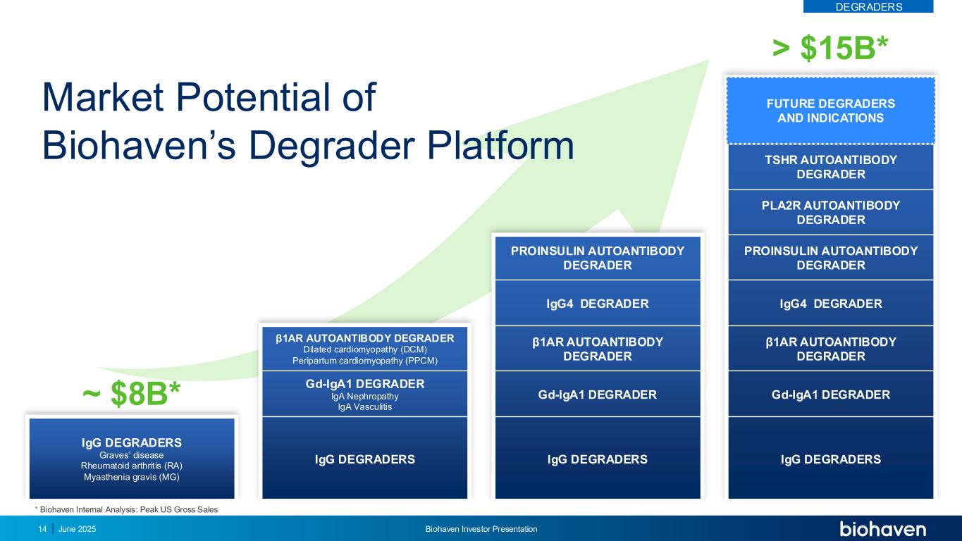 1H 2025 BHV-1300 Graves’ Disease 2025 Study  2026 Topline Data BHV-1310 Myasthenia Gravis Study BHV-1600 Cardiomyopathy Study New MoDE and TRAP Degraders Enter Phase 1 IgG4 degrader, PLA2R autoantibody degrader,  TSHR autoantibody degrader  2H 2025–2026 BHV-1400 IgA Nephropathy Study BHV-1300 Phase 1 BHV-1400 Phase 1 BHV-1600 Phase 1 2025 MoDE  and  TRAP  platform  validation catalyzes 2026 pivotal  development  in key therapeutic  indications  June 2025 Biohaven Investor Presentation13