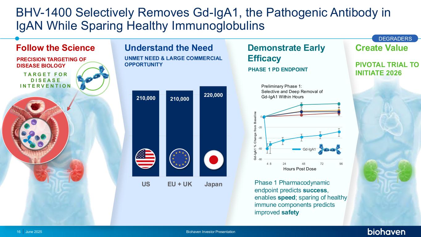 BHV-1400 Selectively Removes Gd-IgA1, the Pathogenic Antibody in  IgAN While Sparing Healthy Immunoglobulins Phase 1 Pharmacodynamic  endpoint predicts success,  enables speed; sparing of healthy  immune components predicts  improved safety Demonstrate Early  Efficacy Create Value PIVOTAL TRIAL TO  INITIATE 2026 PHASE 1 PD ENDPOINT June 2025 Biohaven Investor Presentation16 Understand the Need UNMET NEED & LARGE COMMERCIAL  OPPORTUNITY 210,000 210,000 220,000 US EU + UK Japan PRECISION TARGETING OF  DISEASE BIOLOGY T A R G E T  F O R   D I S E A S E   I N T E R V E N T I O N Follow the Science Preliminary Phase 1: Selective and Deep Removal of  Gd-IgA1 Within Hours -80 -60 -40 -20 0 4 8 24 48 72 96 G d -I g A 1  %  C h a n g e  f ro m  B a s e li n e Hours Post Dose DEGRADERS Gd-IgA1
