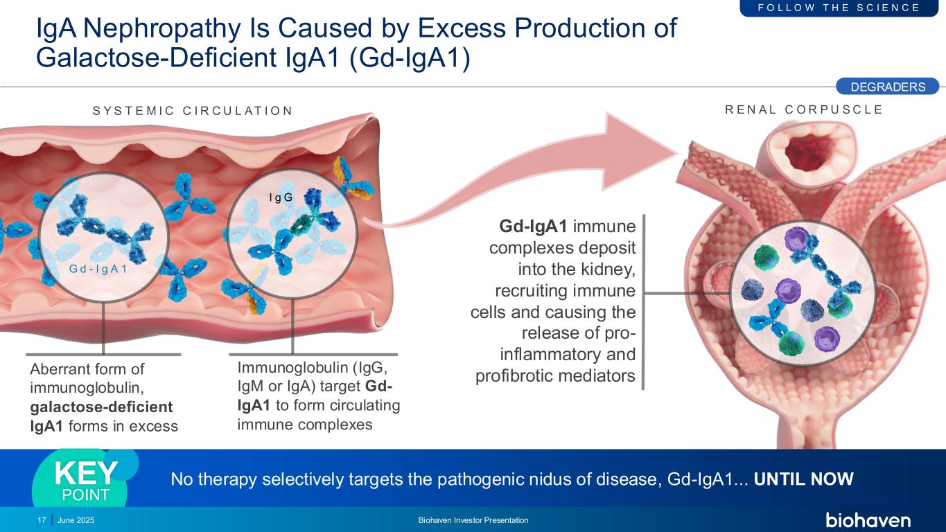 Gd-IgA1 immune  complexes deposit  into the kidney,  recruiting immune  cells and causing the  release of pro- inflammatory and  profibrotic mediators S Y S T E M I C  C I R C U L A T I O N Aberrant form of  immunoglobulin,  galactose-deficient  IgA1 forms in excess  Immunoglobulin (IgG,  IgM or IgA) target Gd- IgA1 to form circulating  immune complexes G d - I g A 1 I g G R E N A L  C O R P U S C L E IgA Nephropathy Is Caused by Excess Production of  Galactose-Deficient IgA1 (Gd-IgA1) No therapy selectively targets the pathogenic nidus of disease, Gd-IgA1... UNTIL NOWKEY  POINT DEGRADERS F O L L O W  T H E  S C I E N C E 17 June 2025 Biohaven Investor Presentation