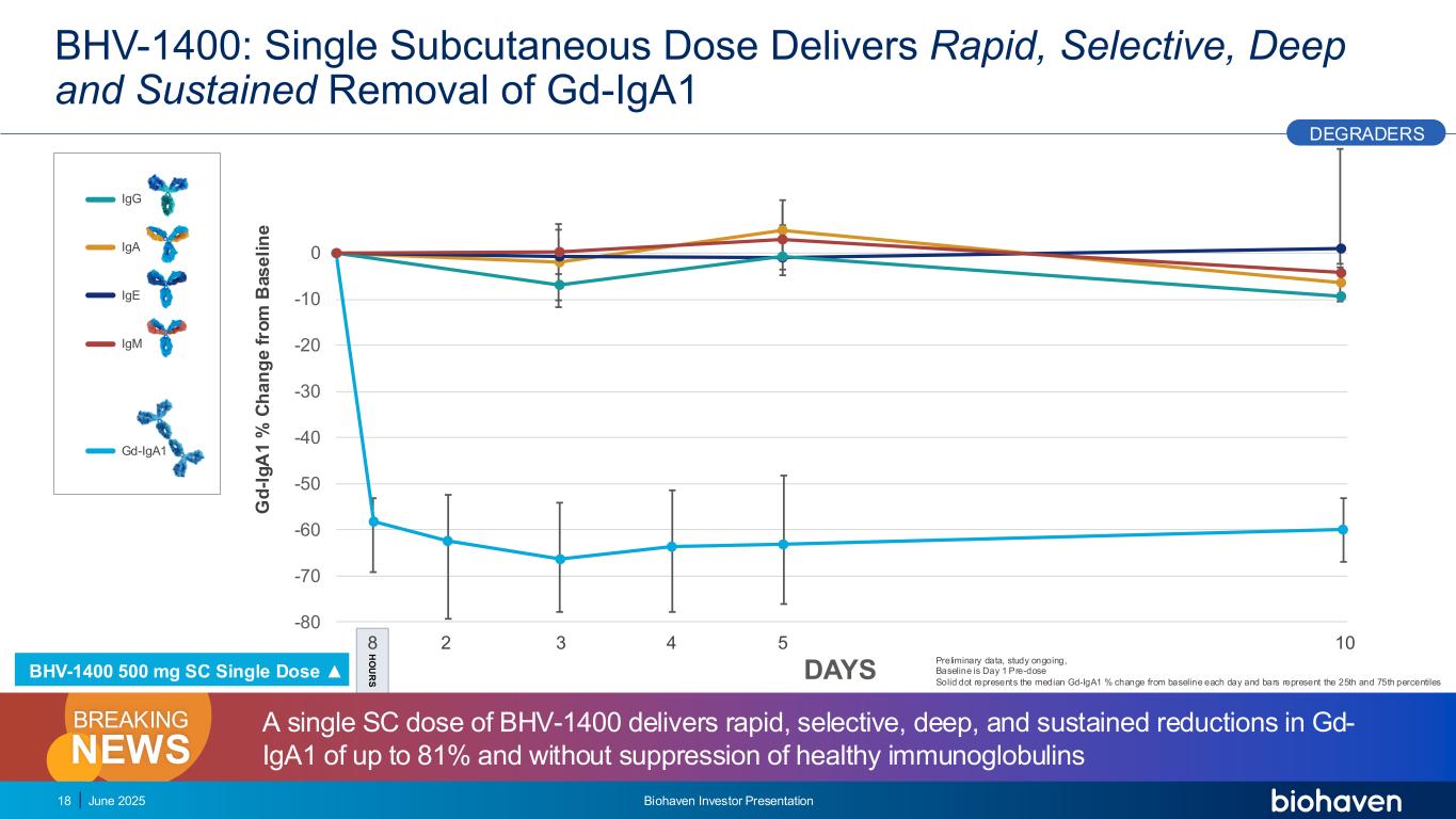 -80 -70 -60 -50 -40 -30 -20 -10 0 BHV-1400: Single Subcutaneous Dose Delivers Rapid, Selective, Deep  and Sustained Removal of Gd-IgA1 G d -I g A 1  %  C h a n g e  f ro m  B a s e li n e IgG IgA IgE IgM Gd-IgA1 18 DAYS 2 3 4 5 108 H O U R S DEGRADERS June 2025 Biohaven Investor Presentation A single SC dose of BHV-1400 delivers rapid, selective, deep, and sustained reductions in Gd- IgA1 of up to 81% and without suppression of healthy immunoglobulinsNEWS BREAKING Preliminary data, study ongoing, Baseline is Day 1 Pre-dose Solid dot represents the median Gd-IgA1 % change from baseline each day and bars represent the 25th and 75th percentiles BHV-1400 500 mg SC Single Dose ▲