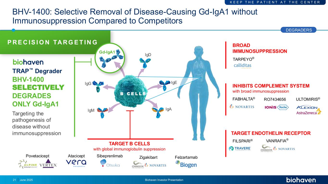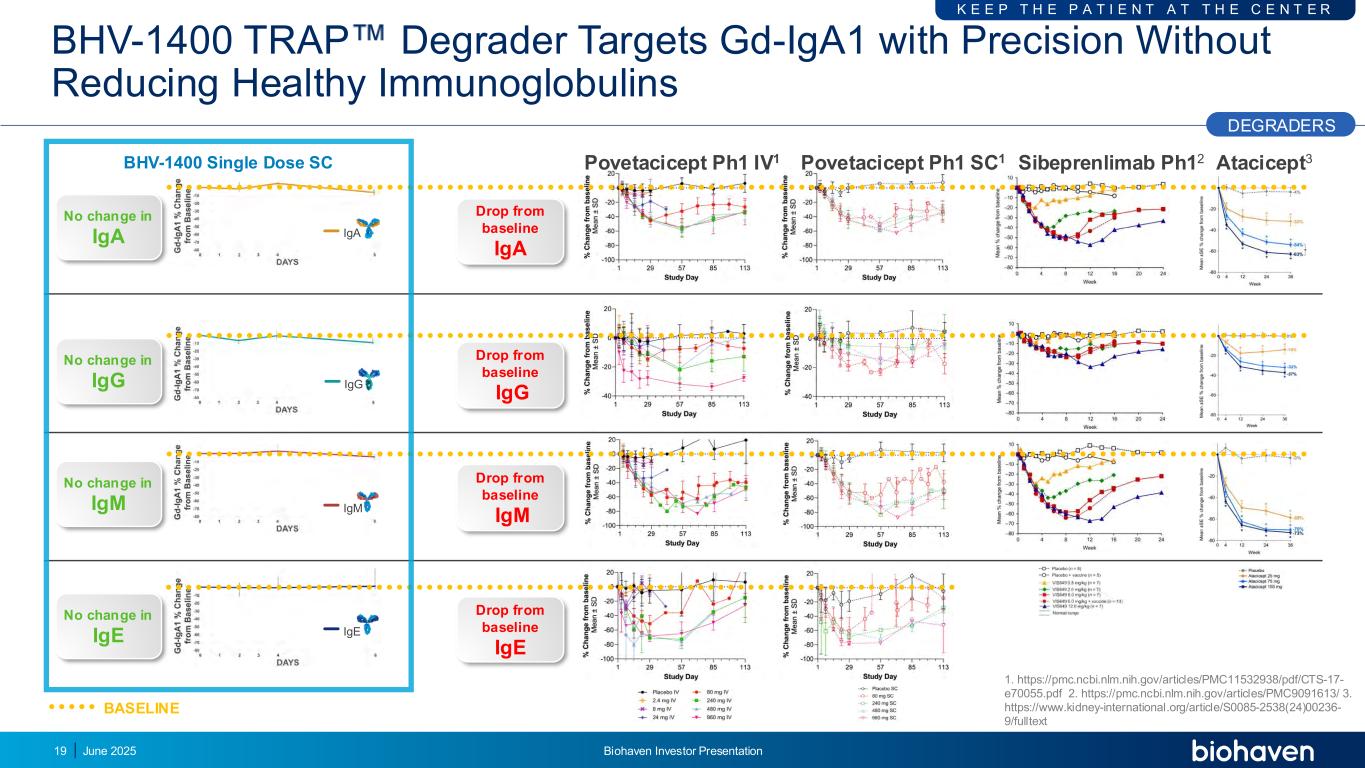 BHV-1400 TRAP  Degrader Targets Gd-IgA1 with Precision Without  Reducing Healthy Immunoglobulins June 2025 Biohaven Investor Presentation19 IgG IgA IgE IgM BHV-1400 Single Dose SC Sibeprenlimab Ph12Povetacicept Ph1 IV1 Povetacicept Ph1 SC1 Atacicept3 DEGRADERS K E E P  T H E  P A T I E N T  A T  T H E  C E N T E R No change in  IgA No change in  IgG No change in  IgM No change in  IgE Drop from  baseline IgA Drop from  baseline  IgG Drop from  baseline  IgM Drop from  baseline  IgE BASELINE 1. https://pmc.ncbi.nlm.nih.gov/articles/PMC11532938/pdf/CTS-17- e70055.pdf  2. https://pmc.ncbi.nlm.nih.gov/articles/PMC9091613/ 3.  https://www.kidney-international.org/article/S0085-2538(24)00236- 9/fulltext