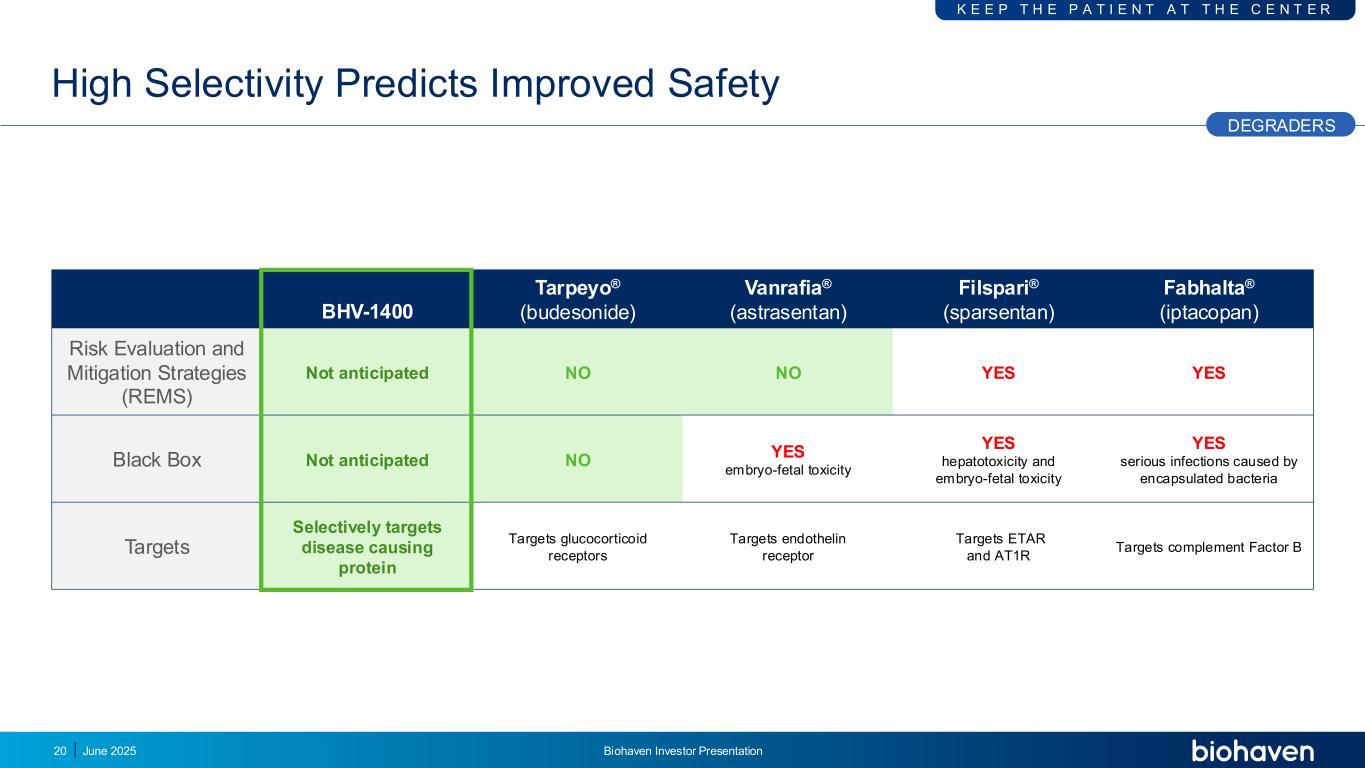 High Selectivity Predicts Improved Safety DEGRADERS BHV-1400 Tarpeyo® (budesonide) Vanrafia® (astrasentan) Filspari® (sparsentan) Fabhalta® (iptacopan) Risk Evaluation and  Mitigation Strategies  (REMS) Not anticipated NO NO YES YES Black Box Not anticipated NO YES embryo-fetal toxicity YES hepatotoxicity and  embryo-fetal toxicity YES serious infections caused by  encapsulated bacteria Targets Selectively targets  disease causing  protein  Targets glucocorticoid  receptors Targets endothelin receptor Targets ETAR  and AT1R Targets complement Factor B 20 K E E P  T H E  P A T I E N T  A T  T H E  C E N T E R June 2025 Biohaven Investor Presentation