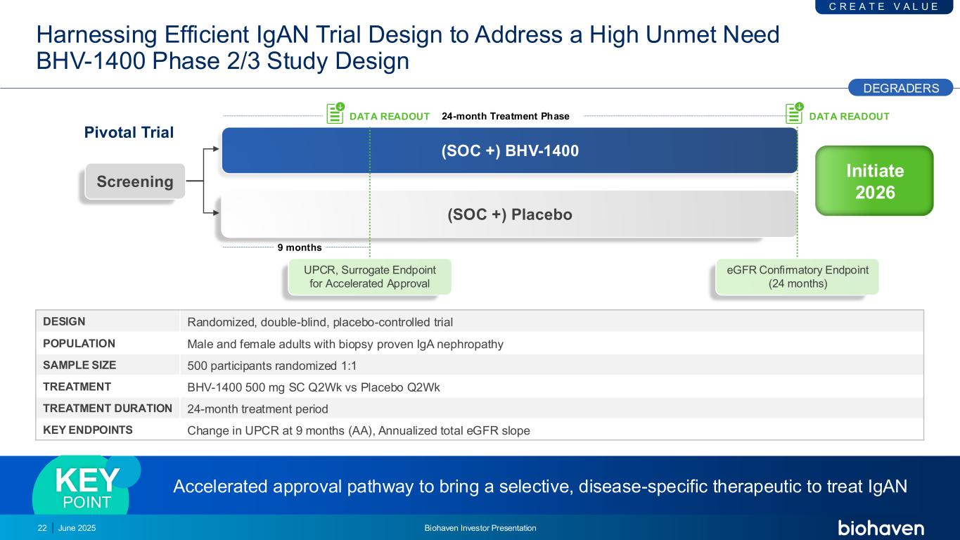 P R E C IS I O N  TA R G E T IN G BHV-1400  SELECTIVELY  DEGRADES  ONLY Gd-IgA1 Targeting the  pathogenesis of  disease without  immunosuppression TARGET B CELLS with global immunoglobulin suppression Povetacicept Atacicept Sibeprenlimab Zigakibart Felzartamab BHV-1400: Selective Removal of Disease-Causing Gd-IgA1 without  Immunosuppression Compared to Competitors TRAP  Degrader IgD IgM IgE IgA IgG Gd-IgA1 B  C E L L S DEGRADERS K E E P  T H E  P A T I E N T  A T  T H E  C E N T E R 21 INHIBITS COMPLEMENT SYSTEM with broad immunosuppression FABHALTA® RO7434656 VANRAFIA® FILSPARI® BROAD IMMUNOSUPPRESSION TARPEYO® ULTOMIRIS® TARGET ENDOTHELIN RECEPTOR June 2025 Biohaven Investor Presentation