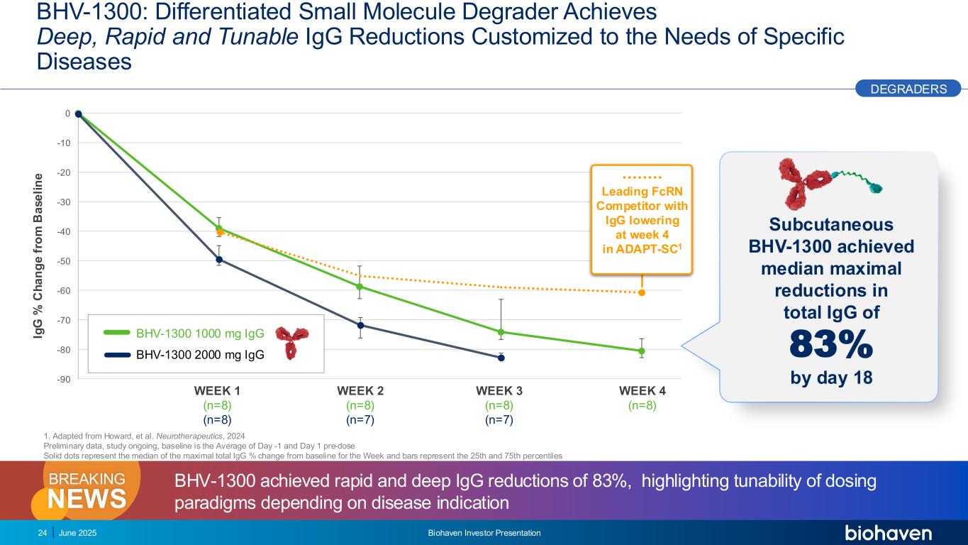 -90 -80 -70 -60 -50 -40 -30 -20 -10 0 BHV-1300: Differentiated Small Molecule Degrader Achieves  Deep, Rapid and Tunable IgG Reductions Customized to the Needs of Specific  Diseases 24 June 2025 Biohaven Investor Presentation Ig G  %  C h a n g e  f ro m  B a s e li n e WEEK 1 (n=8) (n=8) WEEK 2 (n=8) (n=7) WEEK 3 (n=8) (n=7) WEEK 4 (n=8) BHV-1300 1000 mg IgG BHV-1300 2000 mg IgG Subcutaneous  BHV-1300 achieved  median maximal  reductions in  total IgG of  83%  by day 18 BHV-1300 achieved rapid and deep IgG reductions of 83%,  highlighting tunability of dosing  paradigms depending on disease indicationNEWS BREAKING 1. Adapted from Howard, et al. Neurotherapeutics, 2024 Preliminary data, study ongoing, baseline is the Average of Day -1 and Day 1 pre-dose Solid dots represent the median of the maximal total IgG % change from baseline for the Week and bars represent the 25th and 75th percentiles Leading FcRN  Competitor with IgG lowering  at week 4 in ADAPT-SC1 DEGRADERS