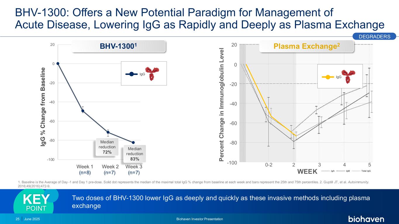 -100 -80 -60 -40 -20 0 20 IgG BHV-1300: Offers a New Potential Paradigm for Management of  Acute Disease, Lowering IgG as Rapidly and Deeply as Plasma Exchange  June 2025 Biohaven Investor Presentation25 Two doses of BHV-1300 lower IgG as deeply and quickly as these invasive methods including plasma  exchange KEY  POINT 1. Baseline is the Average of Day -1 and Day 1 pre-dose. Solid dot represents the median of the maximal total IgG % change from baseline at each week and bars represent the 25th and 75th percentiles. 2. Guptill JT, et al. Autoimmunity.  2016;49(2016):472-9.   0-2 2 3 4 5-100 -80 -60 -40 -20 0 20 IgG P e rc e n t  C h a n g e  i n  I m m u n o g lo b u li n  L e v e l WEEK BHV-13001 Plasma Exchange2 DEGRADERS Median  reduction 72% Median  reduction 83% Week 1 (n=8) Week 2 (n=7) Week 3 (n=7) Ig G  %  C h a n g e  f ro m  B a s e li n e