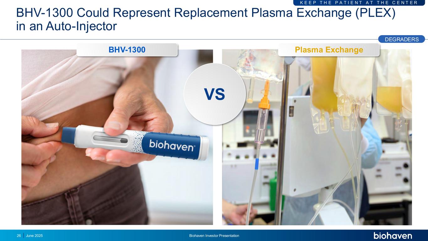 BHV-1300 Plasma Exchange BHV-1300 Could Represent Replacement Plasma Exchange (PLEX)  in an Auto-Injector DEGRADERS K E E P  T H E  P A T I E N T  A T  T H E  C E N T E R VS 26 June 2025 Biohaven Investor Presentation