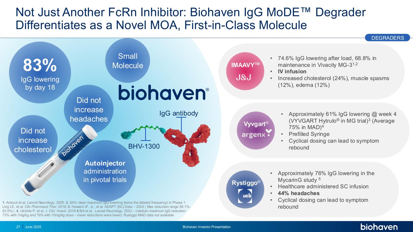 • 74.6% IgG lowering after load, 68.8% in  maintenance in Vivacity MG-31,2 • IV infusion • Increased cholesterol (24%), muscle spasms  (12%), edema (12%) • Approximately 61% IgG lowering @ week 4  (VYVGART Hytrulo® in MG trial)3 (Average  75% in MAD)4 • Prefilled Syringe • Cyclical dosing can lead to symptom  rebound Not Just Another FcRn Inhibitor: Biohaven IgG MoDE  Degrader  Differentiates as a Novel MOA, First-in-Class Molecule IgG antibody BHV-1300 • Approximately 76% IgG lowering in the  MycarinG study 5  • Healthcare administered SC infusion • 44% headaches • Cyclical dosing can lead to symptom  rebound 83%  IgG lowering  by day 18 Did not  increase  cholesterol Did not  increase  headaches Autoinjector  administration  in pivotal trials Vyvgart® IMAAVY Rystiggo® DEGRADERS 27 Small  Molecule 1. Antozzi et al, Lancet Neurology, 2025. 2. 84% mean maximum IgG lowering (twice the labeled frequency) in Phase 1:  Ling LE, et al. Clin Pharmacol Ther. 2019; 3. Howard JF, Jr., et al. ADAPT (SC) Data – 2024 ( Max reduction range 58.1%- 63.5%) ; 4. Ulrichts P, et al. J. Clin. Invest. 2018 5.Bril et al.  Lancet Neurology, 2023 – (median maximum IgG reduction  73% with 7mg/kg and 79% with 10mg/kg dose – mean reductions were lower). Rystiggo MAD data not available June 2025 Biohaven Investor Presentation