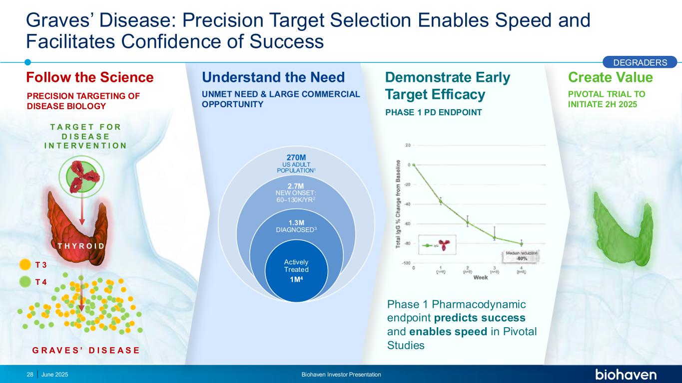 Graves’ Disease: Precision Target Selection Enables Speed and  Facilitates Confidence of Success Follow the Science Understand the Need Phase 1 Pharmacodynamic  endpoint predicts success  and enables speed in Pivotal  Studies PRECISION TARGETING OF  DISEASE BIOLOGY 270M  US ADULT  POPULATION1 2.7M NEW ONSET: 60–130K/YR2 1.3M DIAGNOSED3 Actively  Treated  1M4 UNMET NEED & LARGE COMMERCIAL  OPPORTUNITY T H Y R O I D G R A V E S ’  D I S E A S E T 3 T 4 Demonstrate Early  Target Efficacy T A R G E T  F O R   D I S E A S E   I N T E R V E N T I O N Create Value PIVOTAL TRIAL TO  INITIATE 2H 2025  PHASE 1 PD ENDPOINT DEGRADERS 28 June 2025 Biohaven Investor Presentation