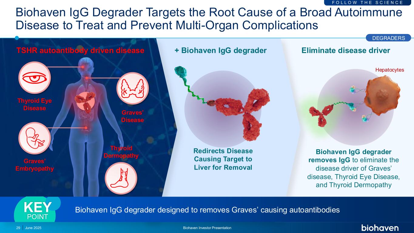 Hepatocytes Biohaven IgG Degrader Targets the Root Cause of a Broad Autoimmune  Disease to Treat and Prevent Multi-Organ Complications June 2025 Biohaven Investor Presentation29 Redirects Disease  Causing Target to  Liver for Removal  + Biohaven IgG degrader Biohaven IgG degrader  removes IgG to eliminate the  disease driver of Graves’  disease, Thyroid Eye Disease,  and Thyroid Dermopathy Eliminate disease driver F O L L O W  T H E  S C I E N C E Thyroid Eye  Disease Thyroid  Dermopathy Graves’  Disease Graves’  Embryopathy TSHR autoantibody driven disease DEGRADERS Biohaven IgG degrader designed to removes Graves’ causing autoantibodiesKEY  POINT