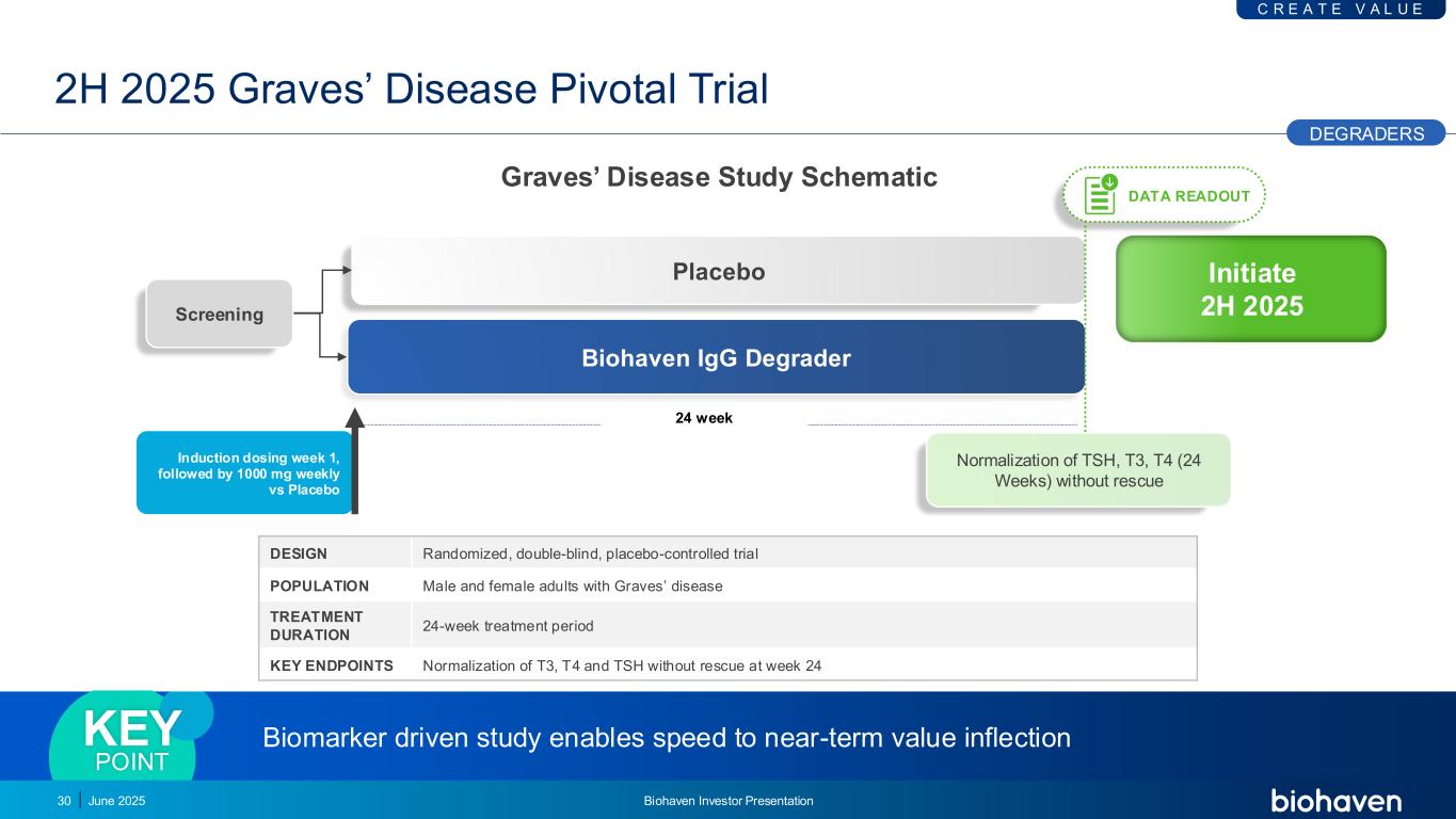 Initiate 2H 2025 2H 2025 Graves’ Disease Pivotal Trial DESIGN Randomized, double-blind, placebo-controlled trial POPULATION Male and female adults with Graves’ disease TREATMENT  DURATION  24-week treatment period KEY ENDPOINTS Normalization of T3, T4 and TSH without rescue at week 24 Biomarker driven study enables speed to near-term value inflectionKEY  POINT 24 week Biohaven IgG Degrader Placebo Screening Induction dosing week 1,  followed by 1000 mg weekly  vs Placebo C R E A T E  V A L U E DEGRADERS 30 DATA READOUT Normalization of TSH, T3, T4 (24  Weeks) without rescue June 2025 Biohaven Investor Presentation Graves’ Disease Study Schematic