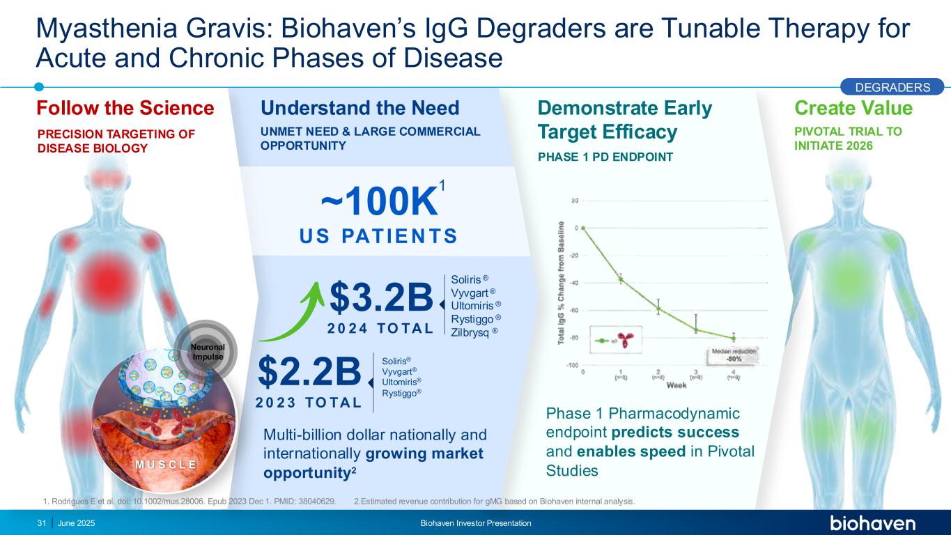 Create Value PIVOTAL TRIAL TO  INITIATE 2026 Myasthenia Gravis: Biohaven’s IgG Degraders are Tunable Therapy for  Acute and Chronic Phases of Disease  Phase 1 Pharmacodynamic  endpoint predicts success  and enables speed in Pivotal  Studies Multi-billion dollar nationally and  internationally growing market  opportunity2 ~100K US  PATIE N TS $3.2B 2 0 2 4  TO TA L Soliris ®  Vyvgart ®  Ultomiris ®  Rystiggo ®  Zilbrysq ®  $2.2B 2 0 2 3  TO TA L Soliris® Vyvgart® Ultomiris® Rystiggo® Understand the Need UNMET NEED & LARGE COMMERCIAL  OPPORTUNITY Demonstrate Early  Target Efficacy PHASE 1 PD ENDPOINT Neuronal  Impulse M U S C L E Follow the Science PRECISION TARGETING OF  DISEASE BIOLOGY DEGRADERS June 2025 1. Rodrigues E et al. doi: 10.1002/mus.28006. Epub 2023 Dec 1. PMID: 38040629.        2.Estimated revenue contribution for gMG based on Biohaven internal analysis. 1 Biohaven Investor Presentation31