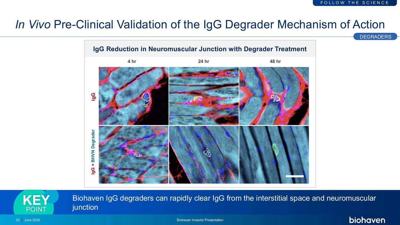 In Vivo Pre-Clinical Validation of the IgG Degrader Mechanism of Action Biohaven IgG degraders can rapidly clear IgG from the interstitial space and neuromuscular  junction KEY  POINT Ig G Ig G  +  B H V N  D e g ra d e r IgG Reduction in Neuromuscular Junction with Degrader Treatment 4 hr 24 hr 48 hr DEGRADERS F O L L O W  T H E  S C I E N C E June 2025 Biohaven Investor Presentation32