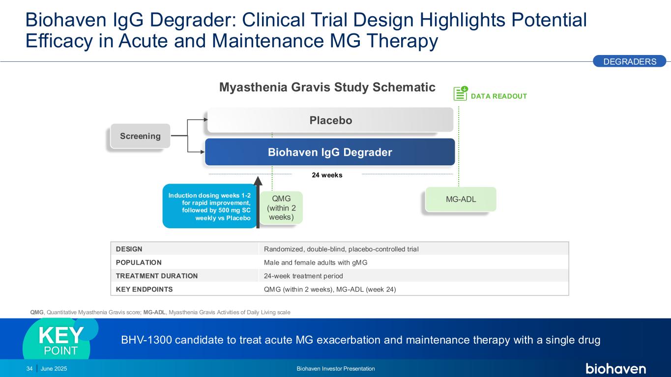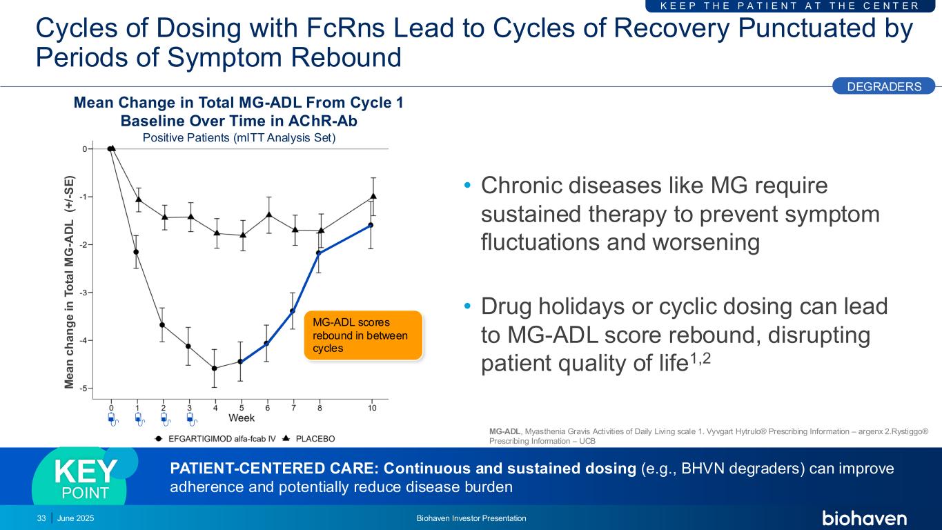 MG-ADL scores rebound in between  cycles Cycles of Dosing with FcRns Lead to Cycles of Recovery Punctuated by  Periods of Symptom Rebound • Chronic diseases like MG require  sustained therapy to prevent symptom  fluctuations and worsening • Drug holidays or cyclic dosing can lead  to MG-ADL score rebound, disrupting  patient quality of life1,2 June 2025 Biohaven Investor Presentation33 K E E P  T H E  P A T I E N T  A T  T H E  C E N T E R Mean Change in Total MG-ADL From Cycle 1  Baseline Over Time in AChR-Ab Positive Patients (mITT Analysis Set) DEGRADERS M e a n  c h a n g e  i n  T o ta l  M G -A D L    (+ /- S E ) PATIENT-CENTERED CARE: Continuous and sustained dosing (e.g., BHVN degraders) can improve  adherence and potentially reduce disease burden KEY  POINT MG-ADL, Myasthenia Gravis Activities of Daily Living scale 1. Vyvgart Hytrulo® Prescribing Information – argenx 2.Rystiggo®  Prescribing Information – UCB