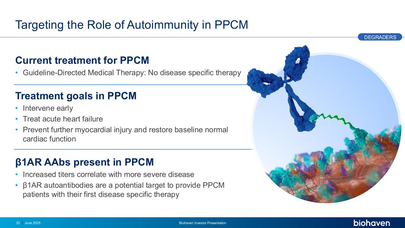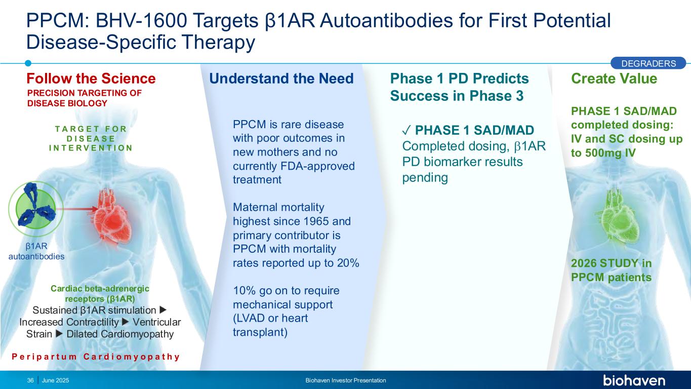 Create Value PHASE 1 SAD/MAD  completed dosing:  IV and SC dosing up  to 500mg IV 2026 STUDY in  PPCM patients PPCM: BHV-1600 Targets β1AR Autoantibodies for First Potential  Disease-Specific Therapy Follow the Science Understand the Need ✓ PHASE 1 SAD/MAD  Completed dosing, 1AR  PD biomarker results  pending PRECISION TARGETING OF  DISEASE BIOLOGY Phase 1 PD Predicts  Success in Phase 3 DEGRADERS P e r i p a r t u m  C a r d i o m y o p a t h y Cardiac beta-adrenergic  receptors (β1AR) Sustained β1AR stimulation   Increased Contractility  Ventricular  Strain  Dilated Cardiomyopathy  β1AR   autoantibodies  T A R G E T  F O R   D I S E A S E   I N T E R V E N T I O N June 2025 Biohaven Investor Presentation36 PPCM is rare disease  with poor outcomes in  new mothers and no  currently FDA-approved  treatment Maternal mortality  highest since 1965 and  primary contributor is  PPCM with mortality  rates reported up to 20% 10% go on to require  mechanical support  (LVAD or heart  transplant)