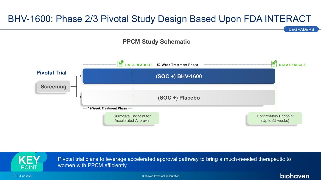 12-Week Treatment Phase 52-Week Treatment Phase (SOC +) BHV-1600 (SOC +) Placebo Screening BHV-1600: Phase 2/3 Pivotal Study Design Based Upon FDA INTERACT 37 Pivotal Trial  Surrogate Endpoint for  Accelerated Approval DATA READOUT DATA READOUT Confirmatory Endpoint (Up to 52 weeks) DEGRADERS Pivotal trial plans to leverage accelerated approval pathway to bring a much-needed therapeutic to  women with PPCM efficiently KEY  POINT June 2025 Biohaven Investor Presentation PPCM Study Schematic