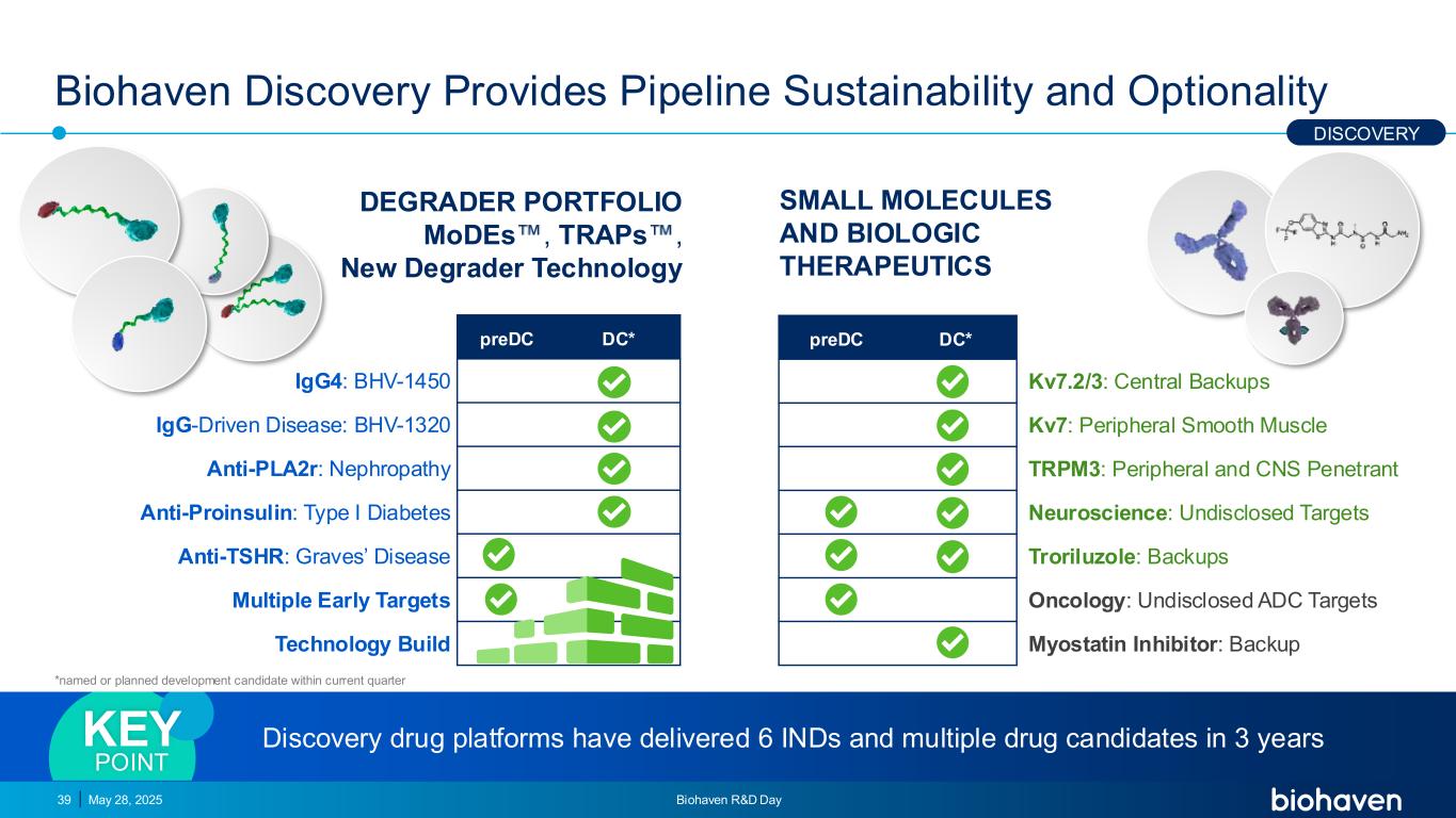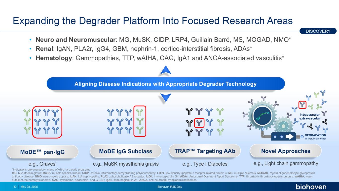 Expanding the Degrader Platform Into Focused Research Areas • Neuro and Neuromuscular: MG, MuSK, CIDP, LRP4, Guillain Barré, MS, MOGAD, NMO* • Renal: IgAN, PLA2r, IgG4, GBM, nephrin-1, cortico-interstitial fibrosis, ADAs* • Hematology: Gammopathies, TTP, wAIHA, CAG, IgA1 and ANCA-associated vasculitis* May 28, 2025 Biohaven R&D Day40 DISCOVERY MoDE  pan-IgG MoDE IgG Subclass TRAP  Targeting AAb Novel Approaches DEGRADATION  in liver, brain, other intravascular extravascular Aligning Disease Indications with Appropriate Degrader Technology e.g., Graves’ e.g., MuSK myasthenia gravis e.g., Type I Diabetes e.g., Light chain gammopathy *Indications are exemplary, many of which are early programs MG, Myasthenia gravis; MuSK, muscle-specific kinase; CIDP, chronic Inflammatory demyelinating polyneuropathy; LRP4, low-density lipoprotein receptor-related protein 4; MS, multiple sclerosis; MOGAD, myelin oligodendrocyte glycoprotein  antibody disease; NMO, neuromyelitis optica; IgAN, IgA nephropathy; PLA2r, phospholipase A2 receptor; IgG4, Immunoglobulin G4; ADAs, Autosomal Dominant Alport Syndrome; TTP, thrombotic thrombocytopenic purpura; wAIHA, warm  autoimmune hemolytic anemia; CAG, cytarabine, aclarubicin, and G‐CSF; IgA1, immunoglobulin A1; ANCA, anti-neutrophil cytoplasmic antibodies.