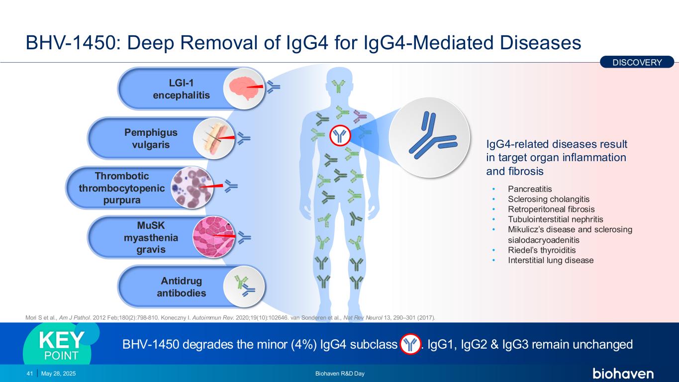 BHV-1450: Deep Removal of IgG4 for IgG4-Mediated Diseases May 28, 2025 Biohaven R&D Day41 IgG4-related diseases result  in target organ inflammation  and fibrosis • Pancreatitis • Sclerosing cholangitis • Retroperitoneal fibrosis • Tubulointerstitial nephritis • Mikulicz’s disease and sclerosing  sialodacryoadenitis  • Riedel’s thyroiditis • Interstitial lung disease BHV-1450 degrades the minor (4%) IgG4 subclass       . IgG1, IgG2 & IgG3 remain unchangedKEY  POINT Thrombotic  thrombocytopenic purpura LGI-1  encephalitis Pemphigus  vulgaris MuSK myasthenia  gravis Antidrug antibodies DISCOVERY Mori S et al., Am J Pathol. 2012 Feb;180(2):798-810. Koneczny I. Autoimmun Rev. 2020;19(10):102646. van Sonderen et al., Nat Rev Neurol 13, 290–301 (2017).
