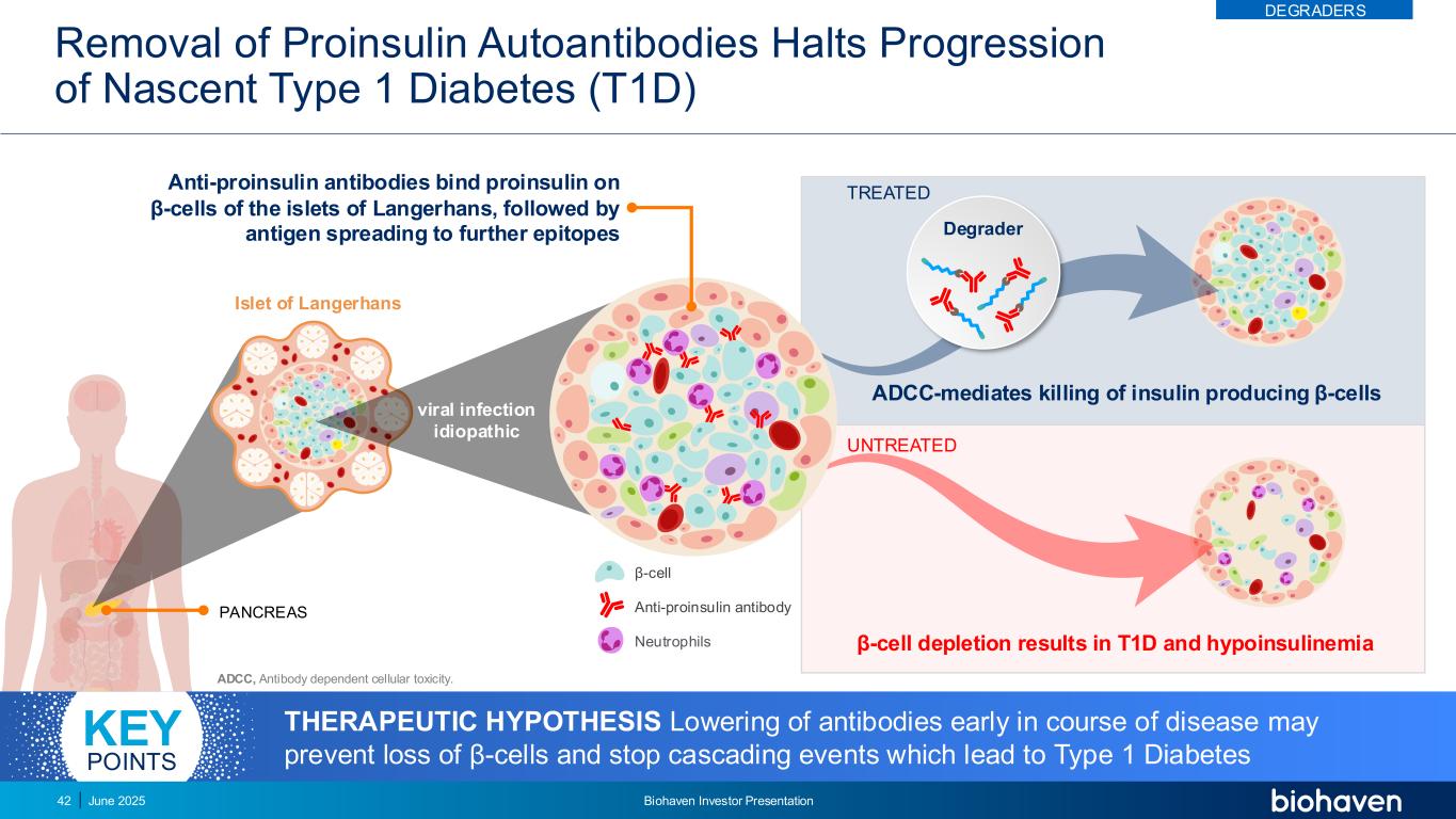Removal of Proinsulin Autoantibodies Halts Progression of Nascent Type 1 Diabetes (T1D)  June 2025 Biohaven Investor Presentation42 Islet of Langerhans PANCREAS  β-cell depletion results in T1D and hypoinsulinemia ADCC-mediates killing of insulin producing β-cells UNTREATED viral infection idiopathic TREATED β-cell Anti-proinsulin antibody Neutrophils Degrader ADCC, Antibody dependent cellular toxicity. THERAPEUTIC HYPOTHESIS Lowering of antibodies early in course of disease may  prevent loss of β-cells and stop cascading events which lead to Type 1 Diabetes KEY  POINTS Anti-proinsulin antibodies bind proinsulin on β-cells of the islets of Langerhans, followed by  antigen spreading to further epitopes DEGRADERS