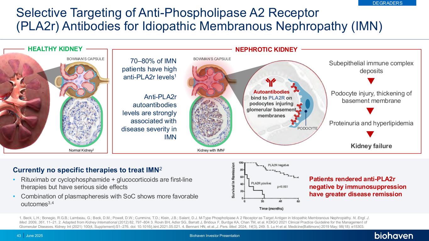 Selective Targeting of Anti-Phospholipase A2 Receptor (PLA2r) Antibodies for Idiopathic Membranous Nephropathy (IMN) HEALTHY KIDNEY Currently no specific therapies to treat IMN2 • Rituximab or cyclophosphamide + glucocorticoids are first-line  therapies but have serious side effects • Combination of plasmapheresis with SoC shows more favorable  outcomes3,4 Patients rendered anti-PLA2r  negative by immunosuppression  have greater disease remission 1. Beck, L.H.; Bonegio, R.G.B.; Lambeau, G.; Beck, D.M.; Powell, D.W.; Cummins, T.D.; Klein, J.B.; Salant, D.J. M-Type Phospholipase A 2 Receptor as Target Antigen in Idiopathic Membranous Nephropathy. N. Engl. J.  Med. 2009, 361, 11–21. 2. Adapted from Kidney International (2012) 82, 797–804 3. Rovin BH, Adler SG, Barratt J, Bridoux F, Burdge KA, Chan TM, et al. KDIGO 2021 Clinical Practice Guideline for the Management of  Glomerular Diseases. Kidney Int (2021) 100(4, Supplement):S1–276. doi: 10.1016/j.kint.2021.05.021. 4. Bennani HN, et al.,J. Pers. Med. 2024, 14(3), 249. 5. Lu H et al. Medicine(Baltimore) 2019 May; 98(18): e15303. BOWMAN’S CAPSULE70–80% of IMN  patients have high  anti-PLA2r levels1  Anti-PLA2r  autoantibodies  levels are strongly  associated with  disease severity in  IMN Kidney with IMN2 Autoantibodies  bind to PLA2R on  podocytes injuring  glomerular basement  membranes PODOCYTE Subepithelial immune complex  deposits  Podocyte injury, thickening of  basement membrane Proteinuria and hyperlipidemia Kidney failure NEPHROTIC KIDNEY BOWMAN’S CAPSULE Normal Kidney2 DEGRADERS June 2025 Biohaven Investor Presentation43