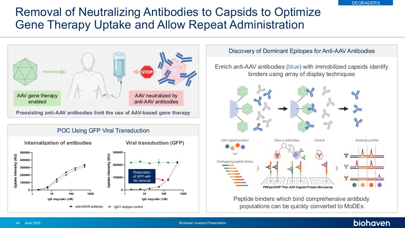 Removal of Neutralizing Antibodies to Capsids to Optimize Gene Therapy Uptake and Allow Repeat Administration Discovery of Dominant Epitopes for Anti-AAV Antibodies 1 10 100 1000 0 100000 200000 300000 400000 500000 BH3746 nM 6 4 7  a re a  ( u m 2 /i m a g e ) Internalization anti-AAV9 antibody IgG1 isotype control Internalization of antibodies 1 10 100 1000 0 100000 200000 300000 BH3746 nM 4 8 8  a re a  ( u m 2 /i m a g e ) Neutralization anti-AAV9 antibody IgG1 isotype control Viral transduction (GFP) IgG degrader (nM)IgG degrader (nM) Restoration  of GFP with  Ab removal Enrich anti-AAV antibodies (blue) with immobilized capsids identify  binders using array of display techniques Peptide binders which bind comprehensive antibody  populations can be quickly converted to MoDEs Preexisting anti-AAV antibodies limit the use of AAV-based gene therapy AAV gene therapy enabled AAV neutralized by  anti-AAV antibodies POC Using GFP Viral Transduction 1 10 100 1000 0 100000 200000 300000 400000 500000 BH3746 nM 6 4 7  a re a  ( u m 2 /i m a g e ) Internalization anti-AAV9 antibody IgG1 isotype control 1 10 100 1000 0 100000 200000 300000 400000 500000 BH3746 nM 6 4 7  a re a  ( u m 2 /i m a g e ) Internalization anti-AAV9 antibody IgG1 isotype control U p ta k e  I n te n s it y  ( A U ) U p ta k e  I n te n s it y  ( A U ) DEGRADERS June 2025 Biohaven Investor Presentation44
