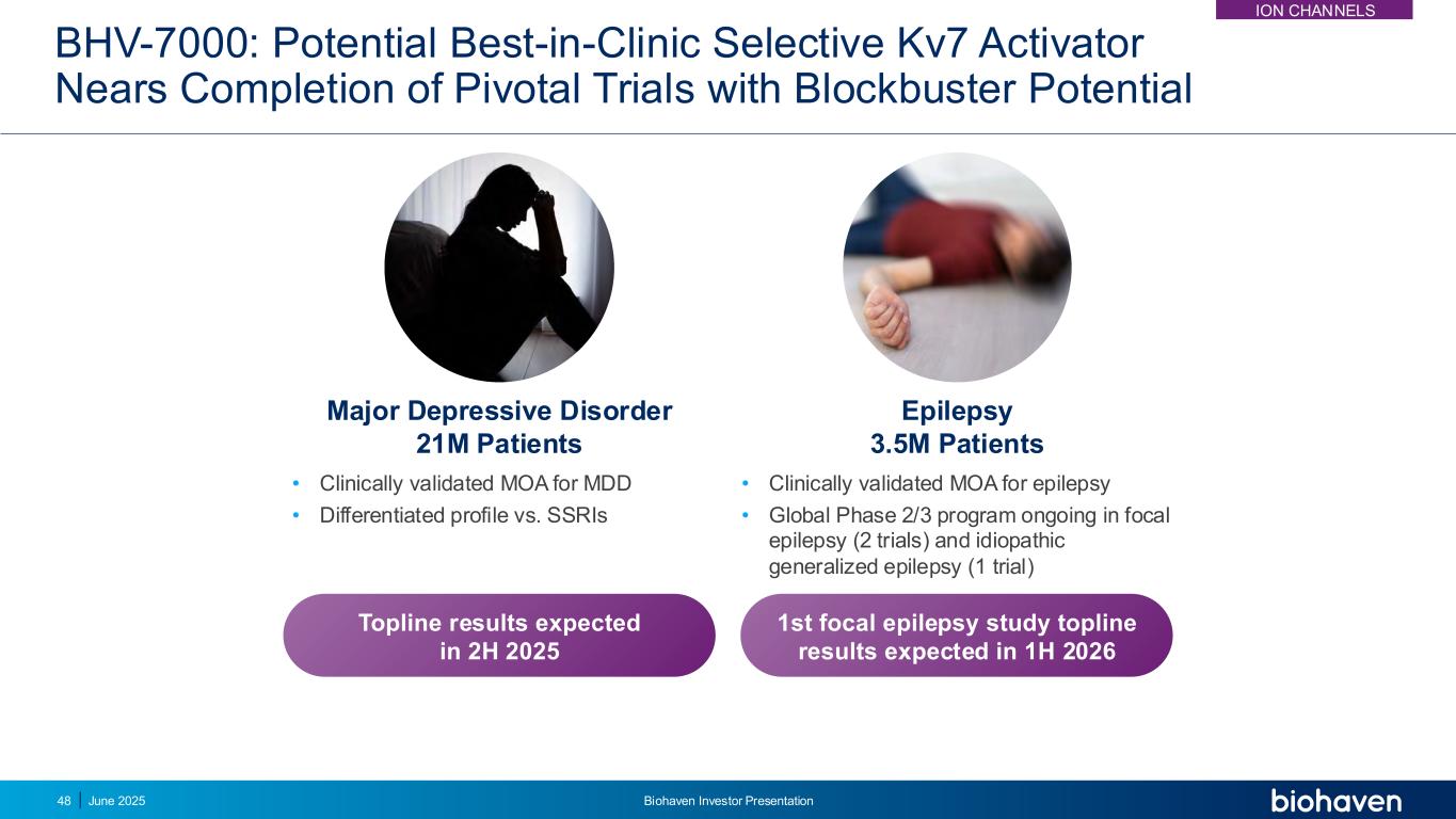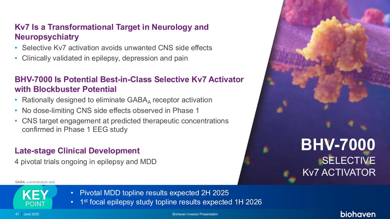 June 2025 Biohaven Investor Presentation47 Kv7 Is a Transformational Target in Neurology and  Neuropsychiatry • Selective Kv7 activation avoids unwanted CNS side effects • Clinically validated in epilepsy, depression and pain BHV-7000 Is Potential Best-in-Class Selective Kv7 Activator  with Blockbuster Potential • Rationally designed to eliminate GABAA receptor activation • No dose-limiting CNS side effects observed in Phase 1 • CNS target engagement at predicted therapeutic concentrations  confirmed in Phase 1 EEG study Late-stage Clinical Development 4 pivotal trials ongoing in epilepsy and MDD BHV-7000 SELECTIVE  Kv7 ACTIVATOR • Pivotal MDD topline results expected 2H 2025   • 1st focal epilepsy study topline results expected 1H 2026 KEY  POINT GABA, γ-aminobutyric acid.