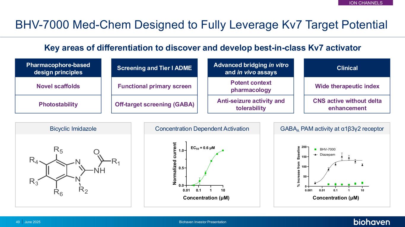 BHV-7000 Med-Chem Designed to Fully Leverage Kv7 Target Potential Key areas of differentiation to discover and develop best-in-class Kv7 activator 49 Pharmacophore-based  design principles Screening and Tier I ADME Advanced bridging in vitro  and in vivo assays Clinical Novel scaffolds Functional primary screen Potent context  pharmacology Wide therapeutic index Photostability Off-target screening (GABA) Anti-seizure activity and  tolerability CNS active without delta  enhancement 0.001 0.01 0.1 1 10 0 50 100 150 200 Concentration (M) %  I n c re a s e  f ro m    B a s e li n e BHV-7000 Diazepam 0.001 0.01 0.1 1 10 0 50 100 150 200 Concentration (M) %  I n c re a s e  f ro m    B a s e li n e BHV-7000 Diazepam GABAA PAM activity at α1β3γ2 receptor  0.01 0.1 1 10 0.0 0.5 1.0 Concentration (M) N o rm a li z e d  c u rr e n t EC50 = 0.6 µM Concentration Dependent Activation oncentration (μM) Concentration (μM) Bicyclic Imidazole June 2025 Biohaven Investor Presentation ION CHANNELS