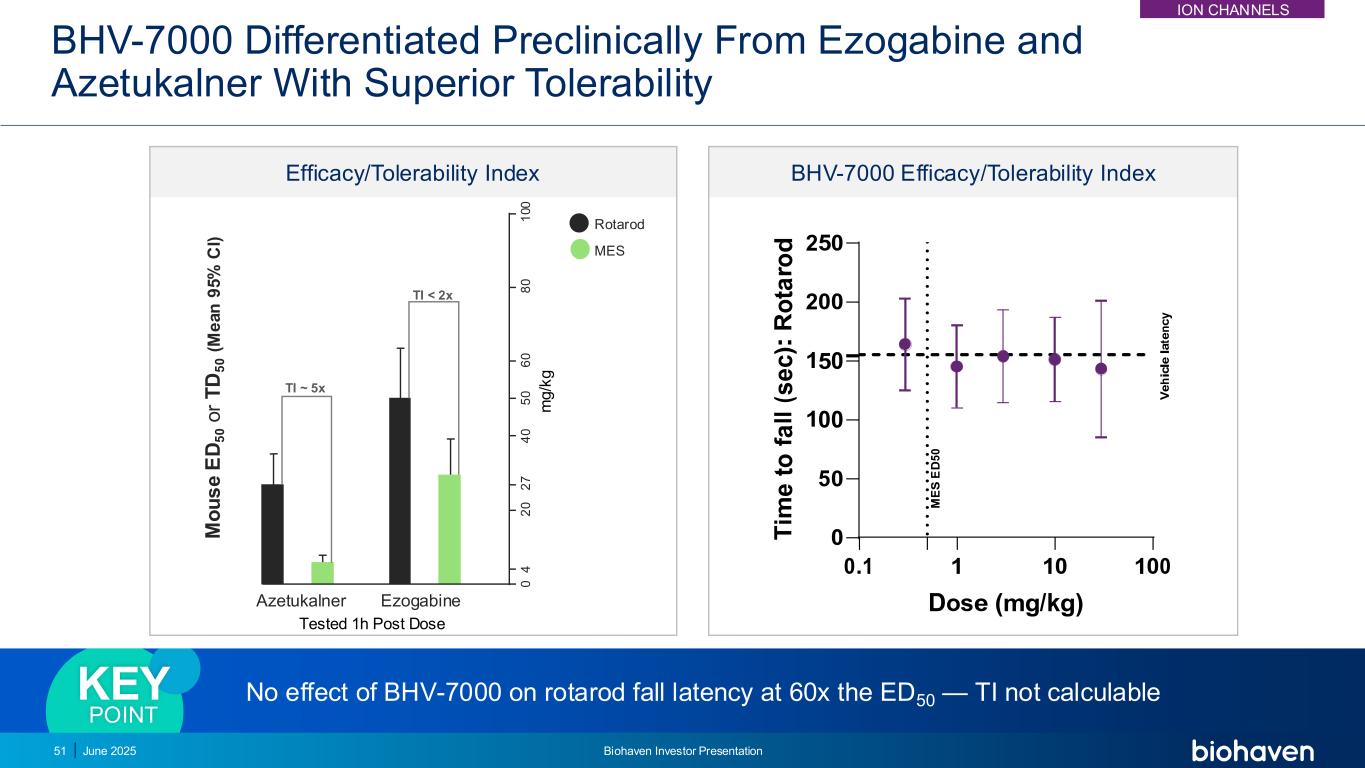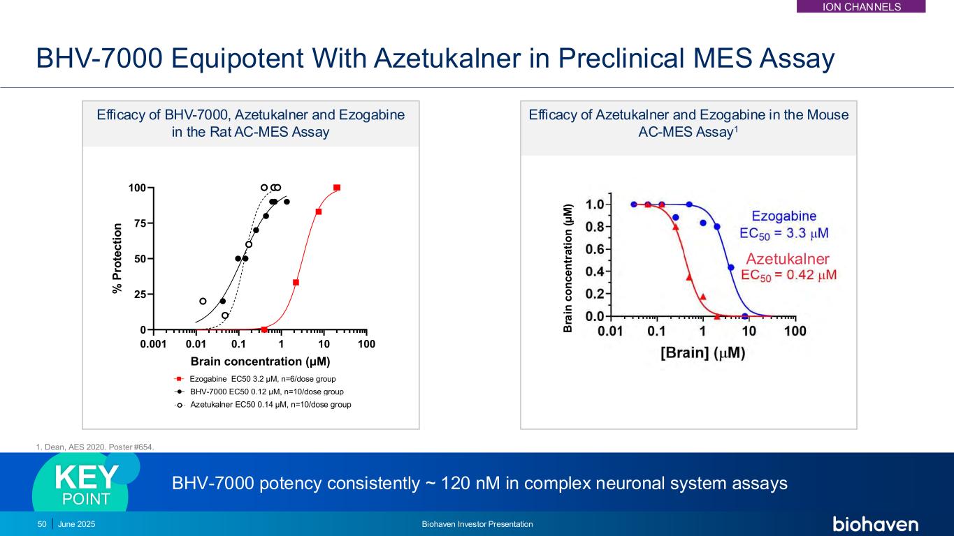 BHV-7000 potency consistently ~ 120 nM in complex neuronal system assaysKEY  POINT BHV-7000 Equipotent With Azetukalner in Preclinical MES Assay Efficacy of BHV-7000, Azetukalner and Ezogabine  in the Rat AC-MES Assay 0.001 0.01 0.1 1 10 100 0 25 50 75 100 Maximal Electroshock Model (rat) Brain concentration (μM) %  P ro te c ti o n BHV-7000 EC50 0.12 μM, n=10/dose group XEN1101 EC50 0.14 μM, n=10/dose group Ezogabine  EC50 3.2 μM, n=6/dose group 0.001 0.01 0.1 1 10 100 0 25 50 75 100 Maximal Electroshock Model (rat) Brain concentration (μM) %  P ro te c ti o n BHV-7000 EC50 0.12 , n=10/dose group XEN1101 EC50 0.14 μM, n=10/dose group Ezogabine  EC50 3.2 μM, n=6/dose group Efficacy of Azetukalner and Ezogabine in the Mouse  AC-MES Assay1 1. Dean, AES 2020. Poster #654.  Azetukalner EC50 0.14 μM, n=10/dose group   Azetukalner   50 B ra in  c o n c e n tr a ti o n  ( μ M ) June 2025 Biohaven Investor Presentation ION CHANNELS
