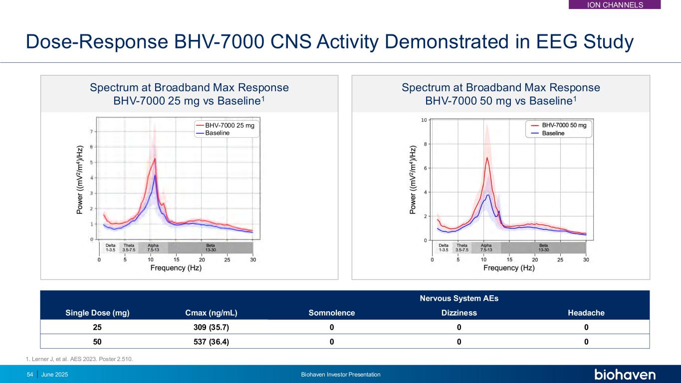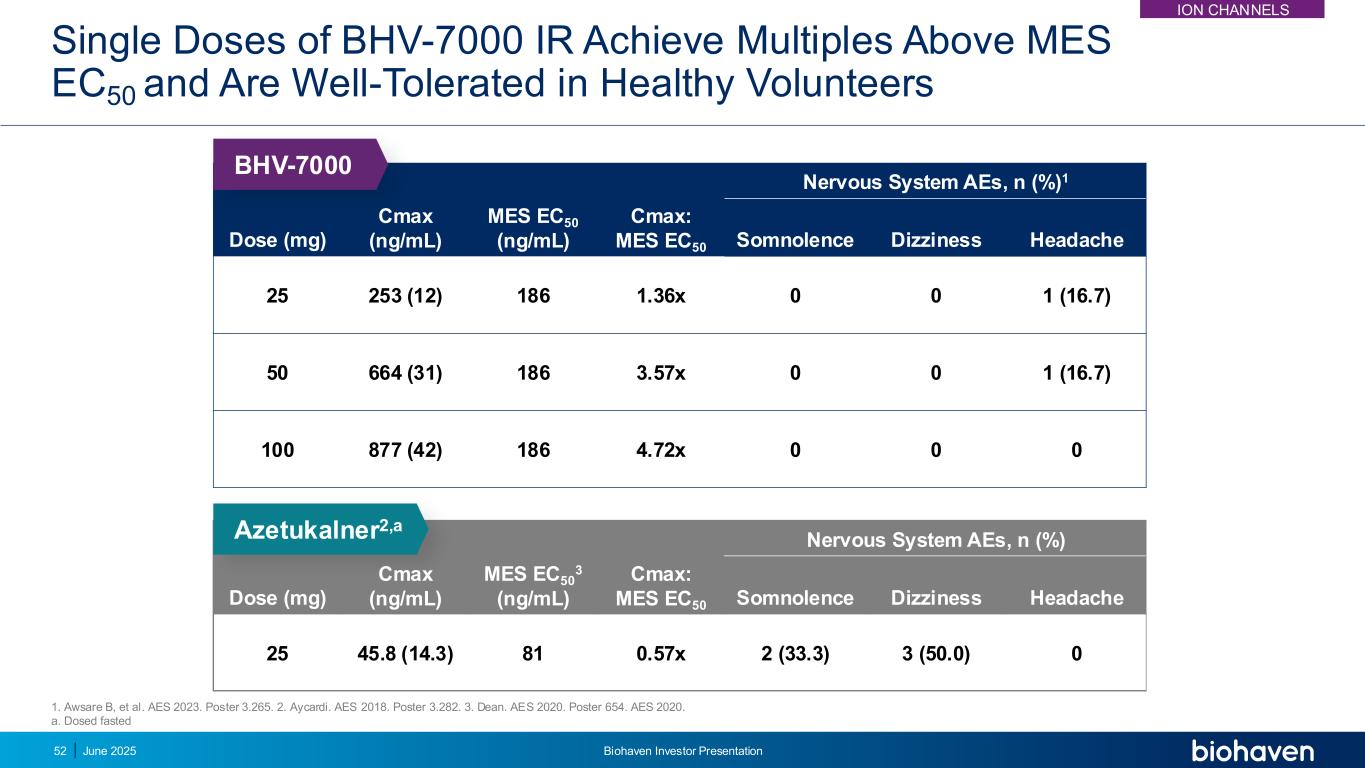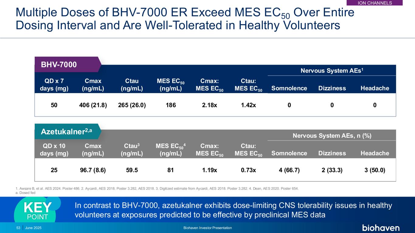 Multiple Doses of BHV-7000 ER Exceed MES EC50 Over Entire  Dosing Interval and Are Well-Tolerated in Healthy Volunteers QD x 7  days (mg) Cmax  (ng/mL) Ctau  (ng/mL) MES EC50  (ng/mL) Cmax:  MES EC50 Ctau:  MES EC50 Nervous System AEs1 Somnolence Dizziness Headache 50 406 (21.8) 265 (26.0) 186 2.18x 1.42x 0 0 0 QD x 10  days (mg) Cmax  (ng/mL) Ctau3  (ng/mL) MES EC50 4   (ng/mL) Cmax:  MES EC50 Ctau:  MES EC50 Nervous System AEs, n (%) Somnolence Dizziness Headache 25 96.7 (8.6) 59.5 81 1.19x 0.73x 4 (66.7) 2 (33.3) 3 (50.0) In contrast to BHV-7000, azetukalner exhibits dose-limiting CNS tolerability issues in healthy  volunteers at exposures predicted to be effective by preclinical MES data KEY  POINT Azetukalner2,a BHV-7000 53 June 2025 Biohaven Investor Presentation 1. Awsare B, et al. AES 2024. Poster 486. 2. Aycardi, AES 2018. Poster 3.282, AES 2018. 3. Digitized estimate from Aycardi, AES 2018. Poster 3.282. 4. Dean, AES 2020. Poster 654. a. Dosed fed  ION CHANNELS