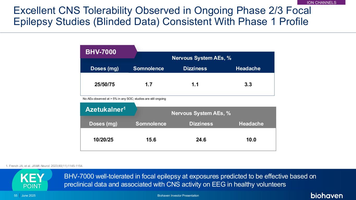 Excellent CNS Tolerability Observed in Ongoing Phase 2/3 Focal  Epilepsy Studies (Blinded Data) Consistent With Phase 1 Profile BHV-7000 well-tolerated in focal epilepsy at exposures predicted to be effective based on  preclinical data and associated with CNS activity on EEG in healthy volunteers KEY  POINT Doses (mg) Nervous System AEs, % Somnolence Dizziness Headache 25/50/75 1.7 1.1 3.3 Doses (mg) Nervous System AEs, % Somnolence Dizziness Headache 10/20/25 15.6 24.6 10.0 Azetukalner1 BHV-7000 No AEs observed at > 5% in any SOC; studies are still ongoing   55 June 2025 Biohaven Investor Presentation 1. French JA, et al. JAMA Neurol. 2023;80(11):1145-1154. ION CHANNELS