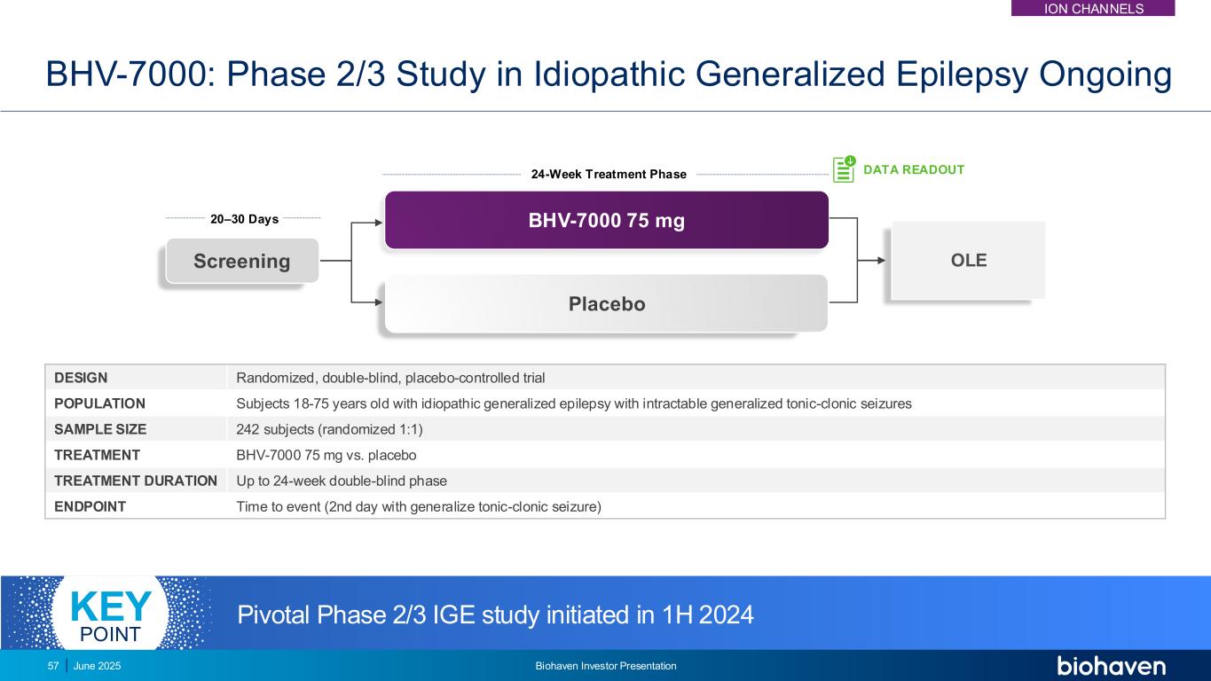 BHV-7000: Two Phase 2/3 Studies in Focal Epilepsy Ongoing DESIGN Randomized, double-blind, placebo-controlled trials POPULATION Subjects 18-75 years of age with refractory focal epilepsy SAMPLE SIZE 390 subjects in each study (randomized 1:1:1) KEY ENTRY CRITERIA Average of ≥4 observable focal seizures per 28 days ENDPOINTS Change in seizure frequency, 50% responder rate, seizure freedom Observation  Phase OLEBHV-7000 50 mg BHV-7000 75 mg Placebo 8-Weeks 8-Week Treatment Phase DATA READOUT OLE Observation  Phase BHV-7000 25 mg Placebo 12-Week Treatment Phase 8-Weeks DATA READOUT BHV-7000 50 mg ION CHANNELS June 2025 Biohaven Investor Presentation56