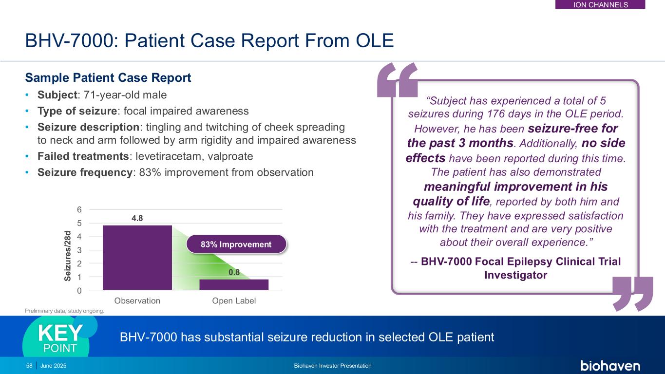 4.8 0.8 0 1 2 3 4 5 6 Observation Open Label BHV-7000: Patient Case Report From OLE Sample Patient Case Report • Subject: 71-year-old male • Type of seizure: focal impaired awareness • Seizure description: tingling and twitching of cheek spreading to neck and arm followed by arm rigidity and impaired awareness • Failed treatments: levetiracetam, valproate • Seizure frequency: 83% improvement from observation “Subject has experienced a total of 5  seizures during 176 days in the OLE period.  However, he has been seizure-free for  the past 3 months. Additionally, no side  effects have been reported during this time.  The patient has also demonstrated  meaningful improvement in his  quality of life, reported by both him and  his family. They have expressed satisfaction  with the treatment and are very positive  about their overall experience.” -- BHV-7000 Focal Epilepsy Clinical Trial  Investigator BHV-7000 has substantial seizure reduction in selected OLE patientKEY  POINT S e iz u re s /2 8 d 83% Improvement 58 June 2025 Biohaven Investor Presentation Preliminary data, study ongoing. ION CHANNELS