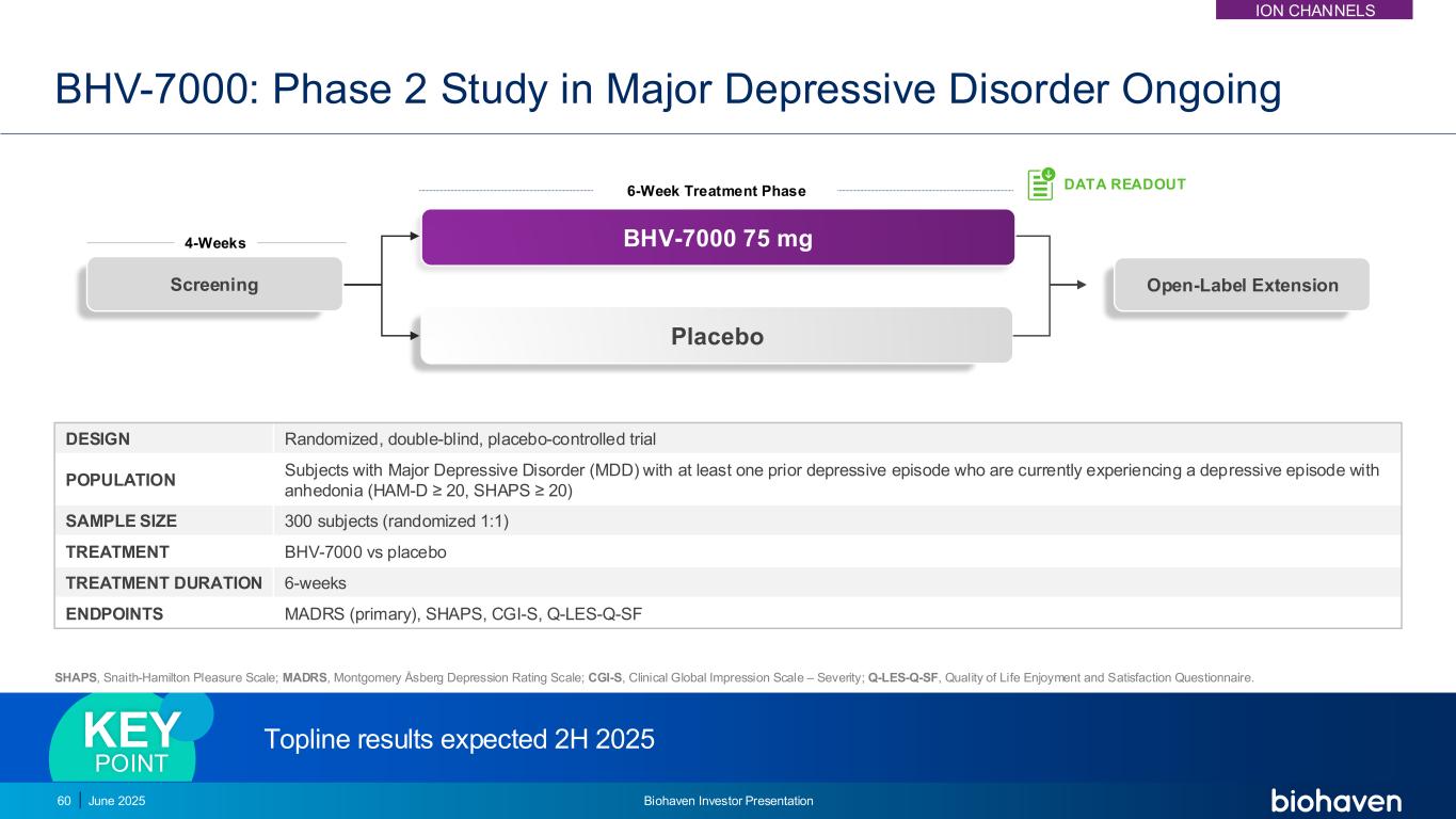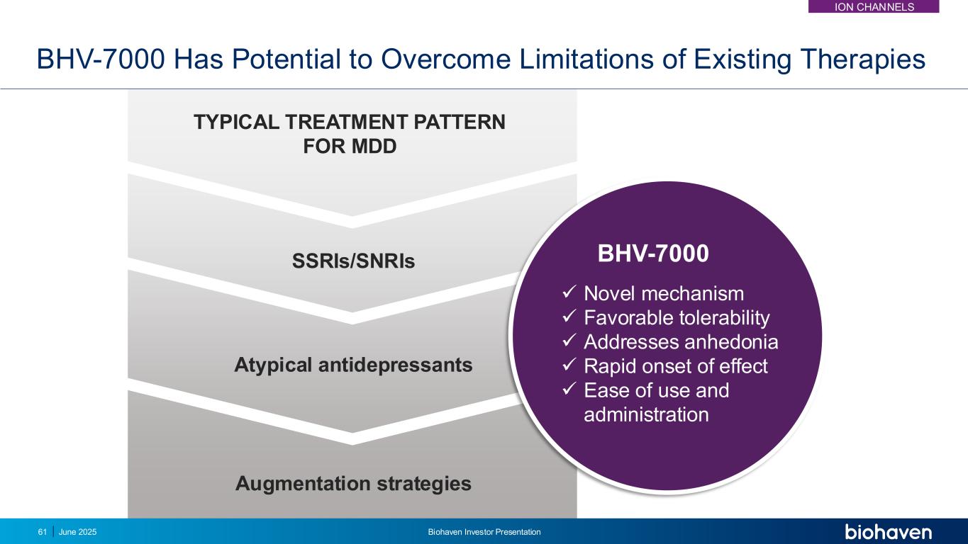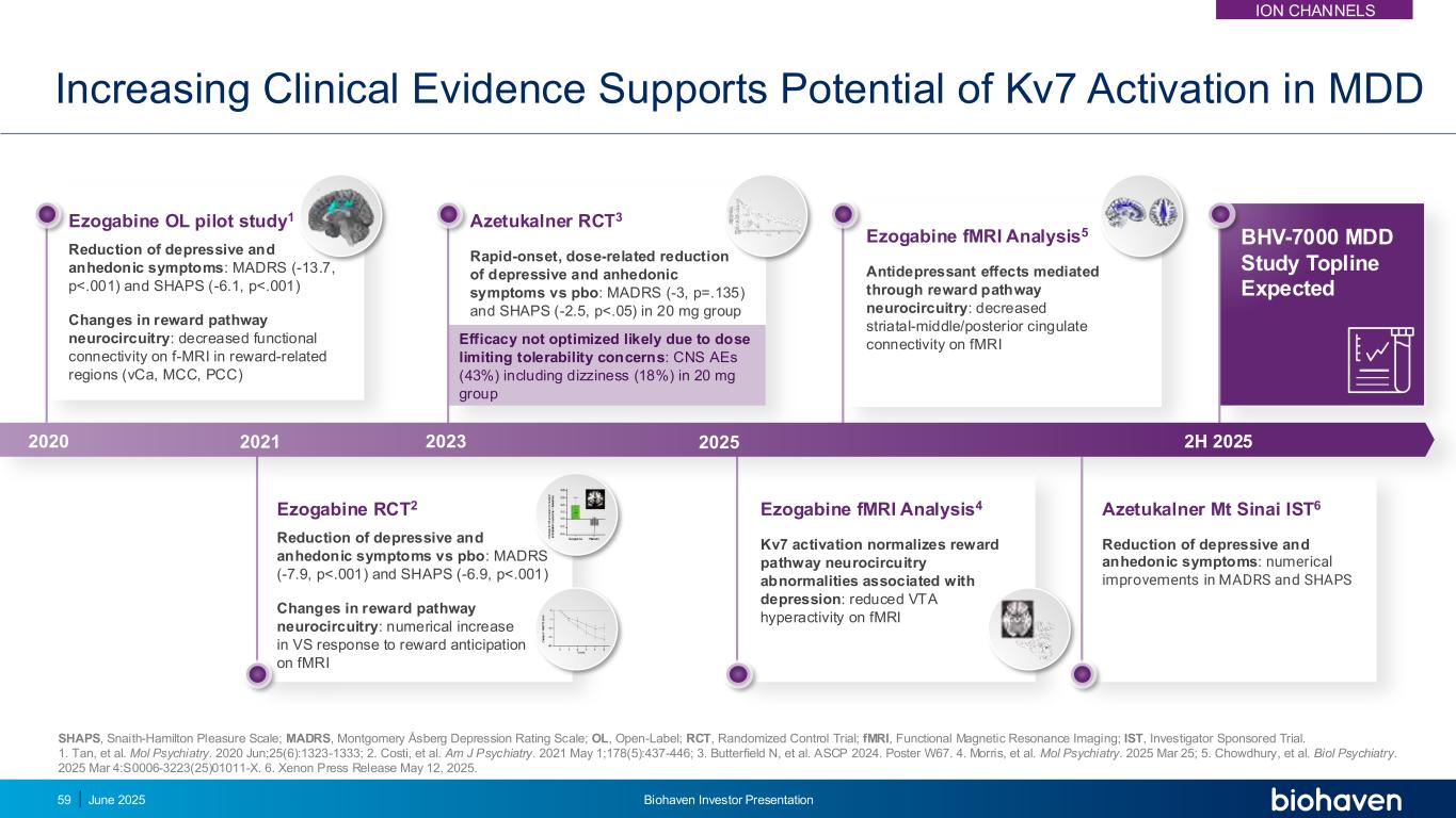 Azetukalner RCT3 Rapid-onset, dose-related reduction of depressive and anhedonic  symptoms vs pbo: MADRS (-3, p=.135)  and SHAPS (-2.5, p<.05) in 20 mg group Efficacy not optimized likely due to dose  limiting tolerability concerns: CNS AEs  (43%) including dizziness (18%) in 20 mg  group Azetukalner Mt Sinai IST6 Reduction of depressive and  anhedonic symptoms: numerical  improvements in MADRS and SHAPS Increasing Clinical Evidence Supports Potential of Kv7 Activation in MDD Ezogabine RCT2 Reduction of depressive and  anhedonic symptoms vs pbo: MADRS  (-7.9, p<.001) and SHAPS (-6.9, p<.001) Changes in reward pathway  neurocircuitry: numerical increase  in VS response to reward anticipation on fMRI Ezogabine OL pilot study1 Reduction of depressive and  anhedonic symptoms: MADRS (-13.7,  p<.001) and SHAPS (-6.1, p<.001) Changes in reward pathway  neurocircuitry: decreased functional  connectivity on f-MRI in reward-related  regions (vCa, MCC, PCC) SHAPS, Snaith-Hamilton Pleasure Scale; MADRS, Montgomery Åsberg Depression Rating Scale; OL, Open-Label; RCT, Randomized Control Trial; fMRI, Functional Magnetic Resonance Imaging; IST, Investigator Sponsored Trial. 1. Tan, et al. Mol Psychiatry. 2020 Jun;25(6):1323-1333; 2. Costi, et al. Am J Psychiatry. 2021 May 1;178(5):437-446; 3. Butterfield N, et al. ASCP 2024. Poster W67. 4. Morris, et al. Mol Psychiatry. 2025 Mar 25; 5. Chowdhury, et al. Biol Psychiatry.  2025 Mar 4:S0006-3223(25)01011-X. 6. Xenon Press Release May 12, 2025. BHV-7000 MDD  Study Topline  Expected Ezogabine fMRI Analysis4 Kv7 activation normalizes reward  pathway neurocircuitry  abnormalities associated with  depression: reduced VTA  hyperactivity on fMRI Ezogabine fMRI Analysis5 Antidepressant effects mediated  through reward pathway  neurocircuitry: decreased striatal-middle/posterior cingulate  connectivity on fMRI 2020 2021 2023 2025 2H 2025 59 June 2025 Biohaven Investor Presentation ION CHANNELS