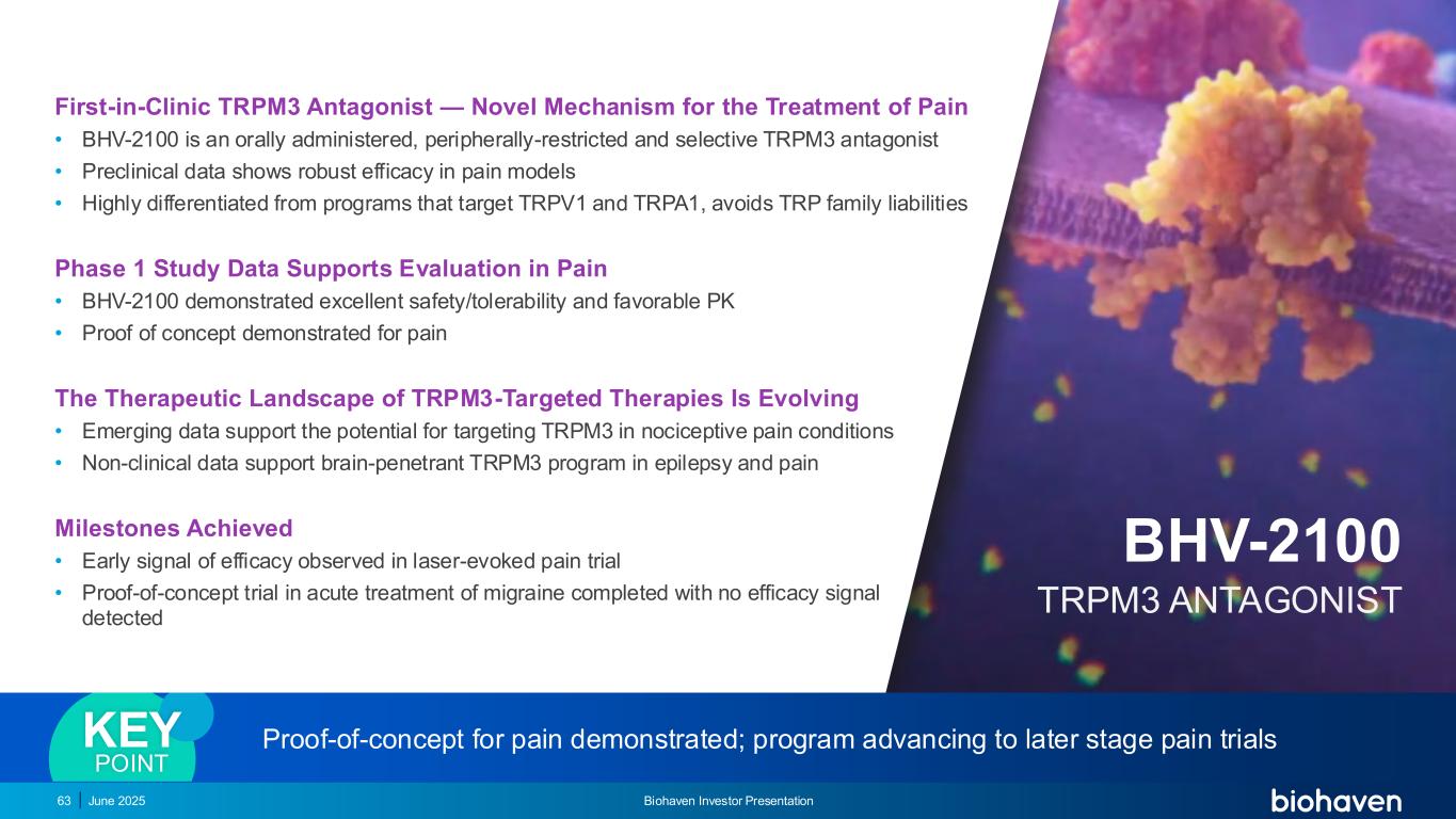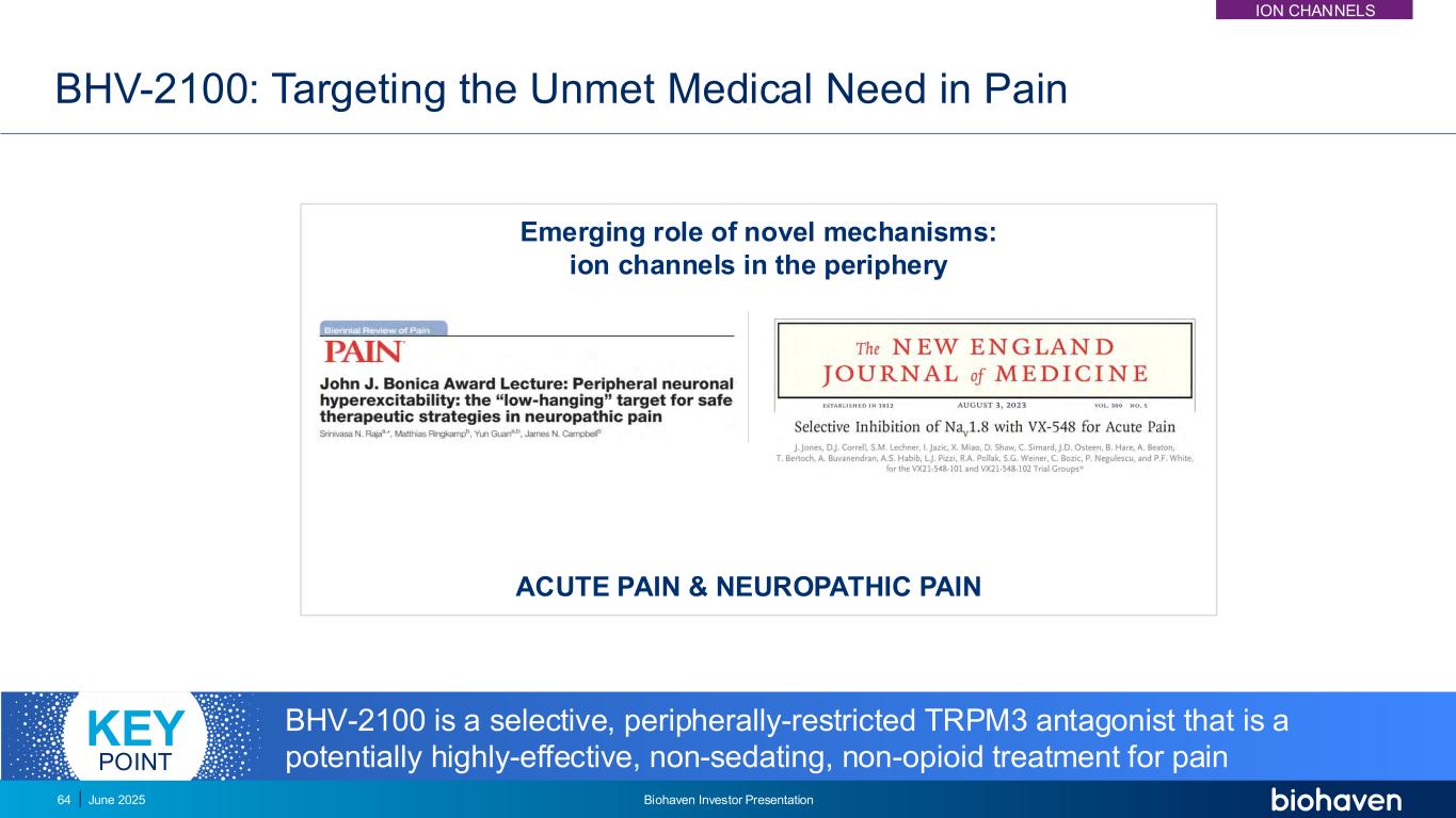 June 2025 Biohaven Investor Presentation63 First-in-Clinic TRPM3 Antagonist — Novel Mechanism for the Treatment of Pain • BHV-2100 is an orally administered, peripherally-restricted and selective TRPM3 antagonist • Preclinical data shows robust efficacy in pain models • Highly differentiated from programs that target TRPV1 and TRPA1, avoids TRP family liabilities Phase 1 Study Data Supports Evaluation in Pain • BHV-2100 demonstrated excellent safety/tolerability and favorable PK • Proof of concept demonstrated for pain The Therapeutic Landscape of TRPM3-Targeted Therapies Is Evolving • Emerging data support the potential for targeting TRPM3 in nociceptive pain conditions • Non-clinical data support brain-penetrant TRPM3 program in epilepsy and pain Milestones Achieved • Early signal of efficacy observed in laser-evoked pain trial • Proof-of-concept trial in acute treatment of migraine completed with no efficacy signal   detected BHV-2100 TRPM3 ANTAGONIST Proof-of-concept for pain demonstrated; program advancing to later stage pain trialsKEY  POINT