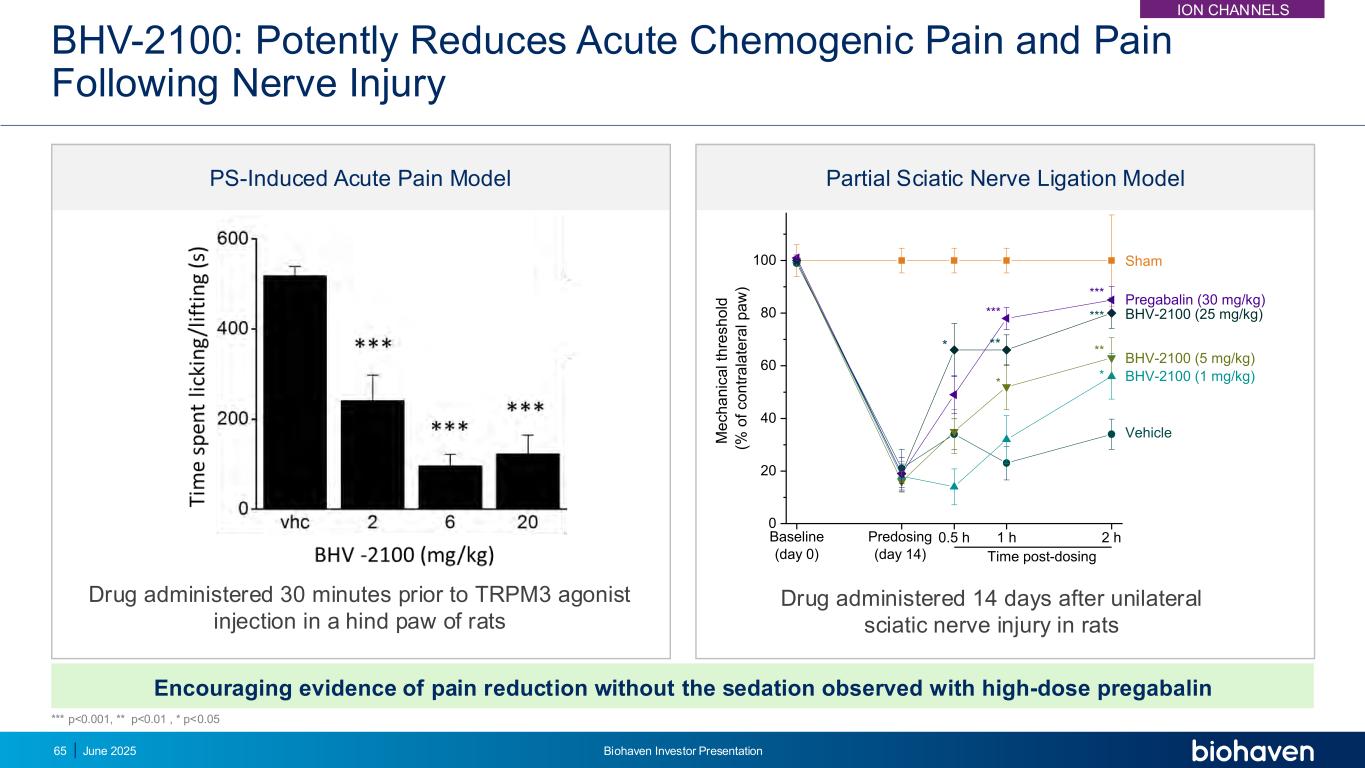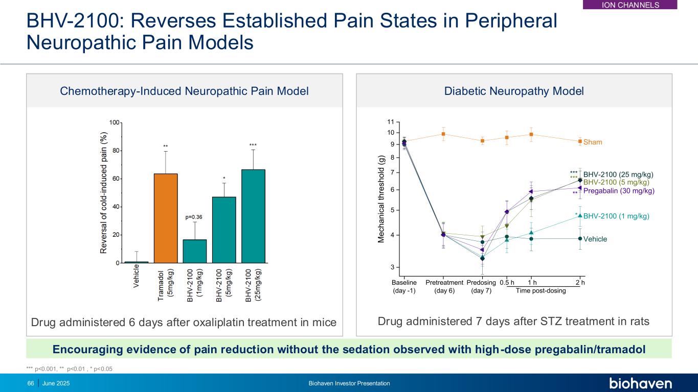BHV-2100: Potently Reduces Acute Chemogenic Pain and Pain  Following Nerve Injury Encouraging evidence of pain reduction without the sedation observed with high-dose pregabalin  Drug administered 30 minutes prior to TRPM3 agonist  injection in a hind paw of rats Drug administered 14 days after unilateral  sciatic nerve injury in rats 0 20 40 60 80 100 * * ** * *** ** *** Vehicle BHV-2100 (1 mg/kg) BHV-2100 (5 mg/kg) BHV-2100 (25 mg/kg) Pregabalin (30 mg/kg) 2 h1 h0.5 hPredosing (day 14) M e c h a n ic a l  th re s h o ld   (%  o f  c o n tr a la te ra l  p a w ) Baseline (day 0) Time post-dosing Sham *** PS-Induced Acute Pain Model Partial Sciatic Nerve Ligation Model *** p<0.001, **  p<0.01 , * p<0.05 ION CHANNELS June 2025 Biohaven Investor Presentation65