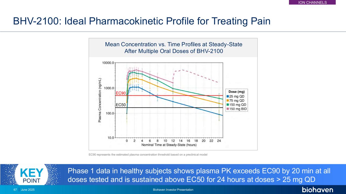 BHV-2100: Ideal Pharmacokinetic Profile for Treating Pain EC90 represents the estimated plasma concentration threshold based on a preclinical model  Phase 1 data in healthy subjects shows plasma PK exceeds EC90 by 20 min at all  doses tested and is sustained above EC50 for 24 hours at doses > 25 mg QD KEY  POINT Mean Concentration vs. Time Profiles at Steady-State  After Multiple Oral Doses of BHV-2100 ION CHANNELS June 2025 Biohaven Investor Presentation67