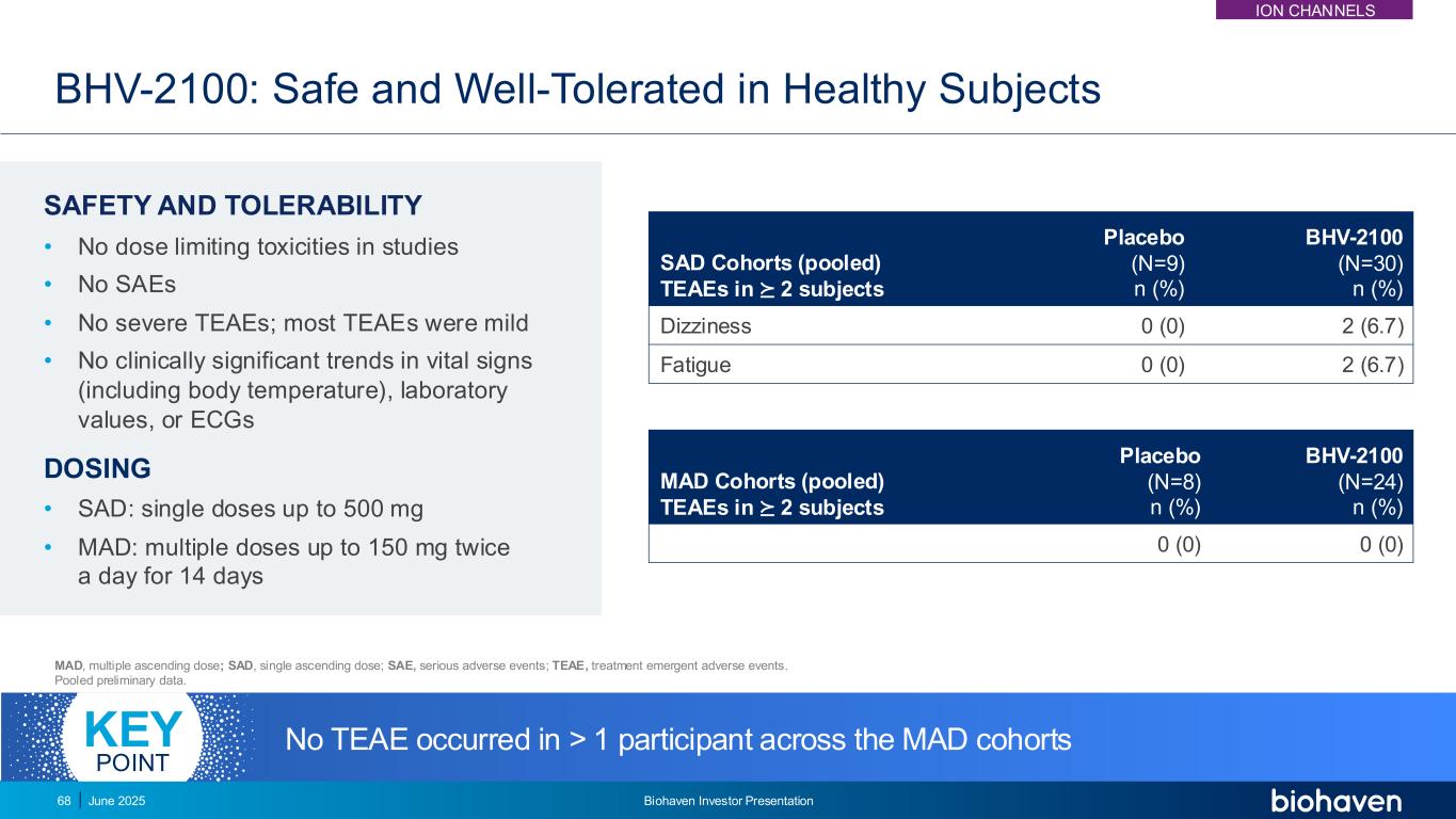 BHV-2100: Safe and Well-Tolerated in Healthy Subjects SAFETY AND TOLERABILITY • No dose limiting toxicities in studies • No SAEs • No severe TEAEs; most TEAEs were mild • No clinically significant trends in vital signs  (including body temperature), laboratory  values, or ECGs DOSING • SAD: single doses up to 500 mg • MAD: multiple doses up to 150 mg twice  a day for 14 days MAD, multiple ascending dose; SAD, single ascending dose; SAE, serious adverse events; TEAE, treatment emergent adverse events. Pooled preliminary data. SAD Cohorts (pooled) TEAEs in ⪰ 2 subjects  Placebo (N=9) n (%) BHV-2100 (N=30) n (%) Dizziness 0 (0) 2 (6.7) Fatigue 0 (0) 2 (6.7) MAD Cohorts (pooled) TEAEs in ⪰ 2 subjects  Placebo (N=8) n (%) BHV-2100 (N=24) n (%) 0 (0) 0 (0) No TEAE occurred in > 1 participant across the MAD cohortsKEY  POINT ION CHANNELS June 2025 Biohaven Investor Presentation68