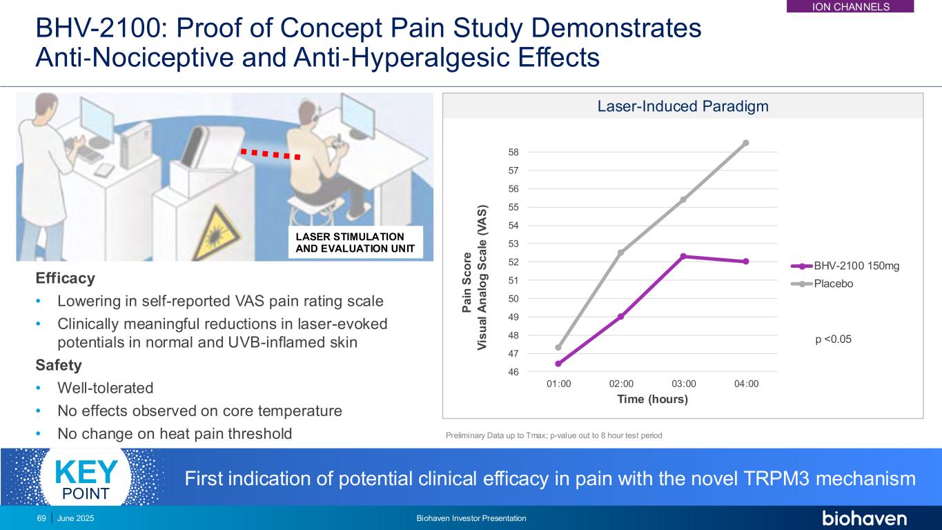 BHV-2100: Proof of Concept Pain Study Demonstrates  Anti‐Nociceptive and Anti‐Hyperalgesic Effects Efficacy • Lowering in self-reported VAS pain rating scale • Clinically meaningful reductions in laser-evoked  potentials in normal and UVB-inflamed skin Safety • Well-tolerated • No effects observed on core temperature • No change on heat pain threshold 46 47 48 49 50 51 52 53 54 55 56 57 58 01:00 02:00 03:00 04:00 V is u a l  A n a lo g  S c a le  ( V A S ) Time (hours)  BHV-2100 150mg Placebo Laser-Induced Paradigm p <0.05 Preliminary Data up to Tmax; p-value out to 8 hour test period  First indication of potential clinical efficacy in pain with the novel TRPM3 mechanismKEY  POINT LASER STIMULATION  AND EVALUATION UNIT P a in  S c o re ION CHANNELS June 2025 Biohaven Investor Presentation69