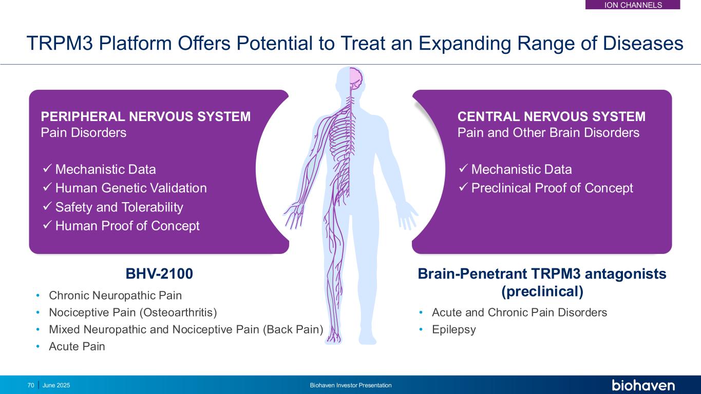 BHV-2100 TRPM3 Platform Offers Potential to Treat an Expanding Range of Diseases • Chronic Neuropathic Pain • Nociceptive Pain (Osteoarthritis) • Mixed Neuropathic and Nociceptive Pain (Back Pain) • Acute Pain ✓Mechanistic Data ✓Human Genetic Validation ✓ Safety and Tolerability ✓Human Proof of Concept PERIPHERAL NERVOUS SYSTEM Pain Disorders CENTRAL NERVOUS SYSTEM Pain and Other Brain Disorders ✓Mechanistic Data ✓ Preclinical Proof of Concept Brain-Penetrant TRPM3 antagonists (preclinical) • Acute and Chronic Pain Disorders • Epilepsy June 2025 Biohaven Investor Presentation70 ION CHANNELS
