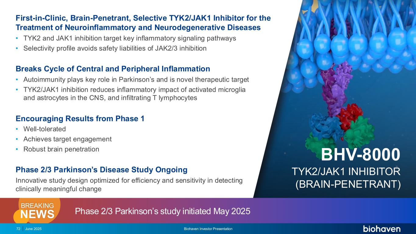 June 2025 Biohaven Investor Presentation72 First-in-Clinic, Brain-Penetrant, Selective TYK2/JAK1 Inhibitor for the  Treatment of Neuroinflammatory and Neurodegenerative Diseases • TYK2 and JAK1 inhibition target key inflammatory signaling pathways • Selectivity profile avoids safety liabilities of JAK2/3 inhibition Breaks Cycle of Central and Peripheral Inflammation • Autoimmunity plays key role in Parkinson’s and is novel therapeutic target • TYK2/JAK1 inhibition reduces inflammatory impact of activated microglia  and astrocytes in the CNS, and infiltrating T lymphocytes Encouraging Results from Phase 1  • Well-tolerated • Achieves target engagement • Robust brain penetration Phase 2/3 Parkinson’s Disease Study Ongoing Innovative study design optimized for efficiency and sensitivity in detecting  clinically meaningful change BHV-8000 TYK2/JAK1 INHIBITOR (BRAIN-PENETRANT) Phase 2/3 Parkinson’s study initiated May 2025NEWS BREAKING