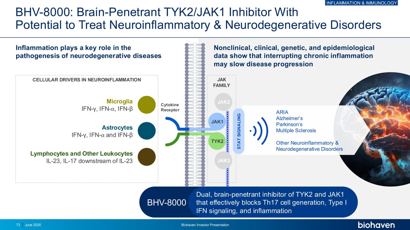 BHV-8000: Brain-Penetrant TYK2/JAK1 Inhibitor With Potential to Treat Neuroinflammatory & Neurodegenerative Disorders Cytokine Receptor JAK FAMILY Microglia IFN-γ, IFN-⍺, IFN-β Astrocytes IFN-γ, IFN-⍺ and IFN-β Lymphocytes and Other Leukocytes IL-23, IL-17 downstream of IL-23 CELLULAR DRIVERS IN NEUROINFLAMMATION Inflammation plays a key role in the  pathogenesis of neurodegenerative diseases Nonclinical, clinical, genetic, and epidemiological  data show that interrupting chronic inflammation  may slow disease progression ARIA Alzheimer’s Parkinson’s Multiple Sclerosis  Other Neuroinflammatory &  Neurodegenerative Disorders JAK2 JAK1 TYK2 S T A T  S IG N A L IN G JAK3 BHV-8000 Dual, brain-penetrant inhibitor of TYK2 and JAK1  that effectively blocks Th17 cell generation, Type I  IFN signaling, and inflammation  INFLAMMATION & IMMUNOLOGY June 2025 Biohaven Investor Presentation73