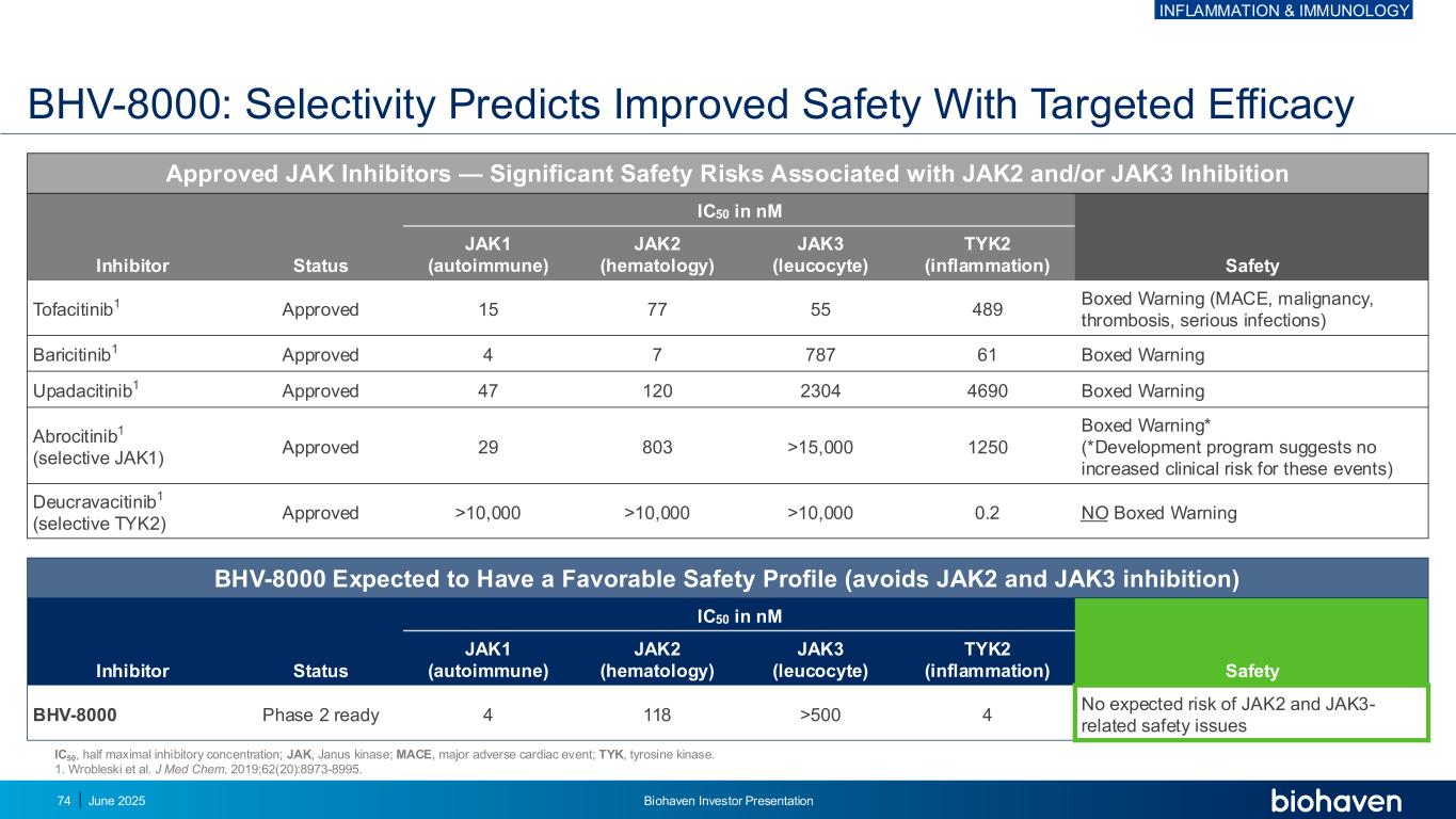 Approved JAK Inhibitors — Significant Safety Risks Associated with JAK2 and/or JAK3 Inhibition Inhibitor Status IC50 in nM Safety JAK1 (autoimmune) JAK2 (hematology) JAK3 (leucocyte) TYK2 (inflammation) Tofacitinib1 Approved 15 77 55 489 Boxed Warning (MACE, malignancy,  thrombosis, serious infections) Baricitinib1 Approved 4 7 787 61 Boxed Warning Upadacitinib1 Approved 47 120 2304 4690 Boxed Warning Abrocitinib1 (selective JAK1) Approved 29 803 >15,000 1250 Boxed Warning* (*Development program suggests no  increased clinical risk for these events) Deucravacitinib1 (selective TYK2) Approved >10,000 >10,000 >10,000 0.2 NO Boxed Warning BHV-8000 Expected to Have a Favorable Safety Profile (avoids JAK2 and JAK3 inhibition) Inhibitor Status IC50 in nM Safety JAK1 (autoimmune) JAK2 (hematology) JAK3 (leucocyte) TYK2 (inflammation) BHV-8000 Phase 2 ready 4 118 >500 4 No expected risk of JAK2 and JAK3- related safety issues IC50, half maximal inhibitory concentration; JAK, Janus kinase; MACE, major adverse cardiac event; TYK, tyrosine kinase. 1. Wrobleski et al. J Med Chem. 2019;62(20):8973-8995. BHV-8000: Selectivity Predicts Improved Safety With Targeted Efficacy INFLAMMATION & IMMUNOLOGY June 2025 Biohaven Investor Presentation74