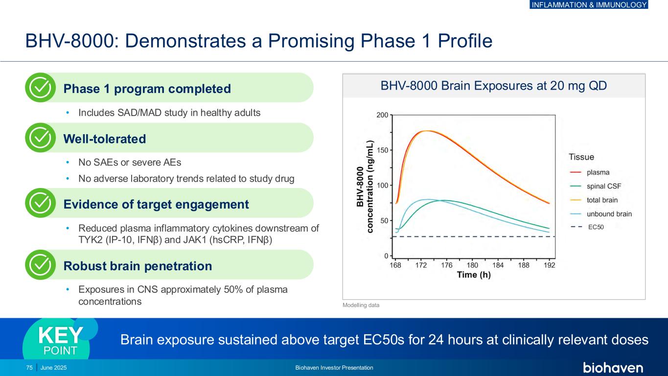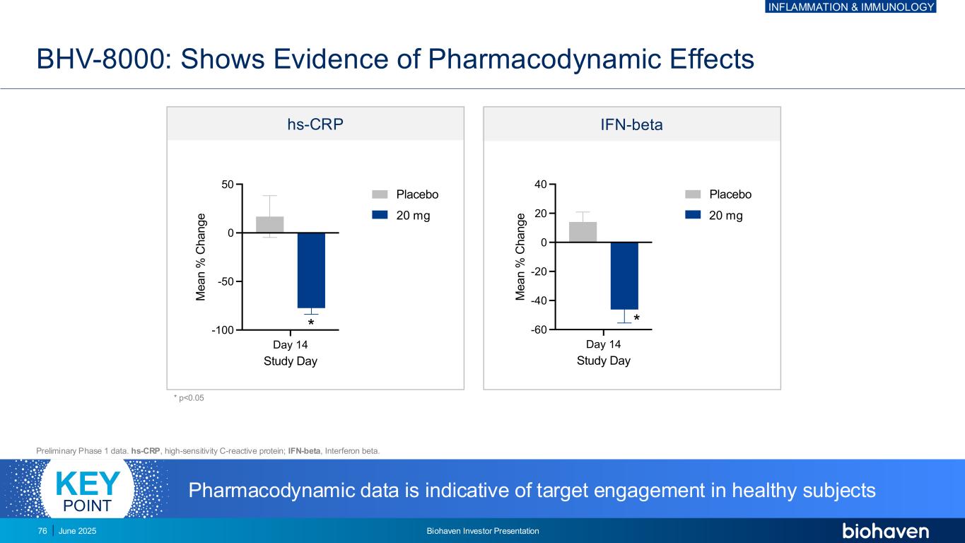 BHV-8000: Demonstrates a Promising Phase 1 Profile Brain exposure sustained above target EC50s for 24 hours at clinically relevant dosesKEY  POINT BHV-8000 Brain Exposures at 20 mg QD EC50 Modelling data Phase 1 program completed  • Includes SAD/MAD study in healthy adults Well-tolerated • No SAEs or severe AEs • No adverse laboratory trends related to study drug Evidence of target engagement • Reduced plasma inflammatory cytokines downstream of  TYK2 (IP-10, IFNβ) and JAK1 (hsCRP, IFNβ)  Robust brain penetration  • Exposures in CNS approximately 50% of plasma  concentrations 75 June 2025 Biohaven Investor Presentation INFLAMMATION & IMMUNOLOGY