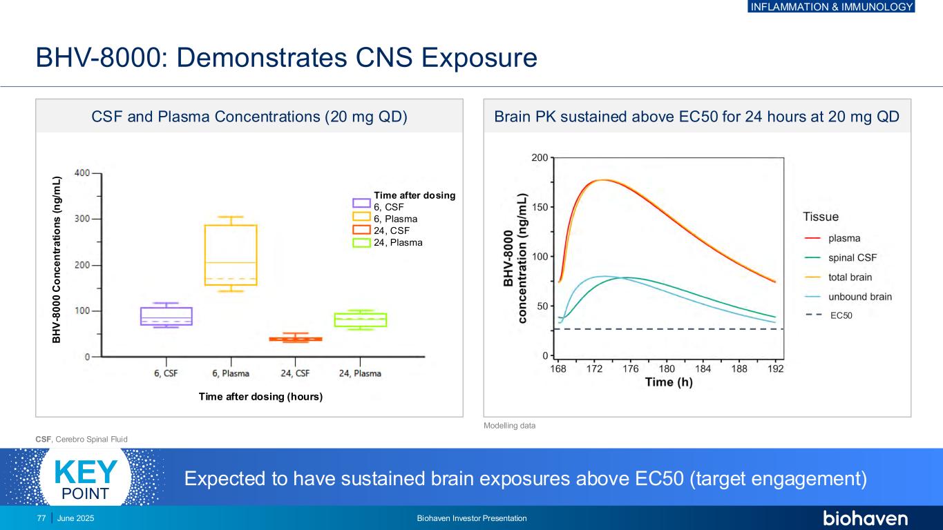 Time after dosing 6, CSF 6, Plasma 24, CSF 24, Plasma BHV-8000: Demonstrates CNS Exposure CSF, Cerebro Spinal Fluid  Expected to have sustained brain exposures above EC50 (target engagement)KEY  POINT CSF and Plasma Concentrations (20 mg QD) Brain PK sustained above EC50 for 24 hours at 20 mg QD B H V -8 0 0 0  C o n c e n tr a ti o n s  ( n g /m L ) Time after dosing (hours) EC50 Modelling data INFLAMMATION & IMMUNOLOGY June 2025 Biohaven Investor Presentation77