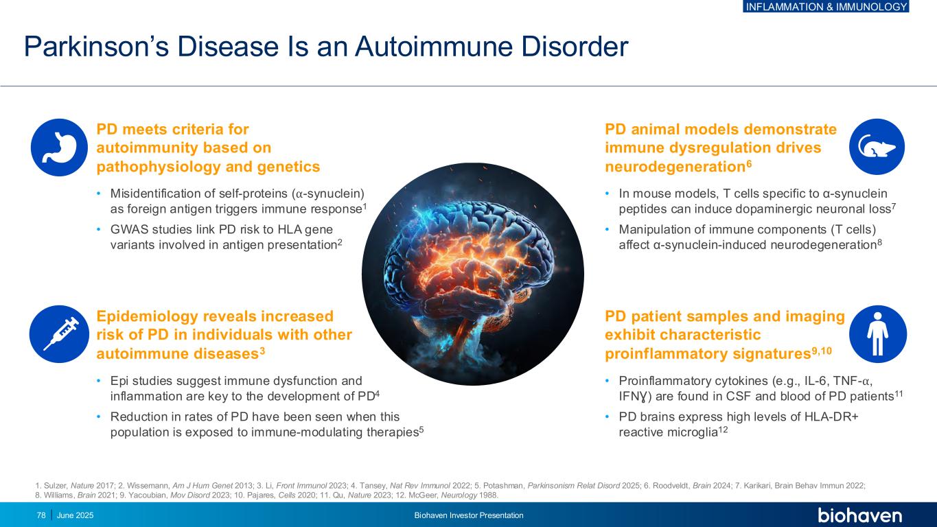 Parkinson’s Disease Is an Autoimmune Disorder 1. Sulzer, Nature 2017; 2. Wissemann, Am J Hum Genet 2013; 3. Li, Front Immunol 2023; 4. Tansey, Nat Rev Immunol 2022; 5. Potashman, Parkinsonism Relat Disord 2025; 6. Roodveldt, Brain 2024; 7. Karikari, Brain Behav Immun 2022; 8. Williams, Brain 2021; 9. Yacoubian, Mov Disord 2023; 10. Pajares, Cells 2020; 11. Qu, Nature 2023; 12. McGeer, Neurology 1988.  • Misidentification of self-proteins (⍺-synuclein)  as foreign antigen triggers immune response1 • GWAS studies link PD risk to HLA gene  variants involved in antigen presentation2 • In mouse models, T cells specific to α-synuclein  peptides can induce dopaminergic neuronal loss7 • Manipulation of immune components (T cells) affect α-synuclein-induced neurodegeneration8 • Epi studies suggest immune dysfunction and  inflammation are key to the development of PD4 • Reduction in rates of PD have been seen when this  population is exposed to immune-modulating therapies5 PD patient samples and imaging  exhibit characteristic  proinflammatory signatures9,10 PD meets criteria for  autoimmunity based on  pathophysiology and genetics Epidemiology reveals increased  risk of PD in individuals with other  autoimmune diseases3 PD animal models demonstrate  immune dysregulation drives  neurodegeneration6 • Proinflammatory cytokines (e.g., IL-6, TNF-⍺,  IFNƔ) are found in CSF and blood of PD patients11 • PD brains express high levels of HLA-DR+  reactive microglia12 78 June 2025 Biohaven Investor Presentation INFLAMMATION & IMMUNOLOGY