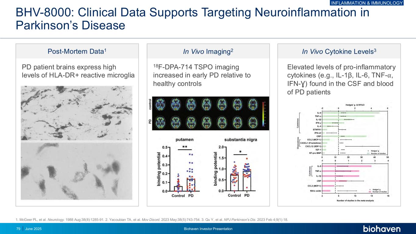 ` BHV-8000: Clinical Data Supports Targeting Neuroinflammation in  Parkinson’s Disease In Vivo Cytokine Levels3 Elevated levels of pro-inflammatory  cytokines (e.g., IL-1β, IL-6, TNF-⍺,  IFN-Ɣ) found in the CSF and blood  of PD patients In Vivo Imaging2 18F-DPA-714 TSPO imaging  increased in early PD relative to  healthy controls  Post-Mortem Data1 PD patient brains express high  levels of HLA-DR+ reactive microglia 1. McGeer PL, et al. Neurology. 1988 Aug;38(8):1285-91. 2. Yacoubian TA, et al. Mov Disord. 2023 May;38(5):743-754. 3. Qu Y, et al. NPJ Parkinson's Dis. 2023 Feb 4;9(1):18.  INFLAMMATION & IMMUNOLOGY June 2025 Biohaven Investor Presentation79